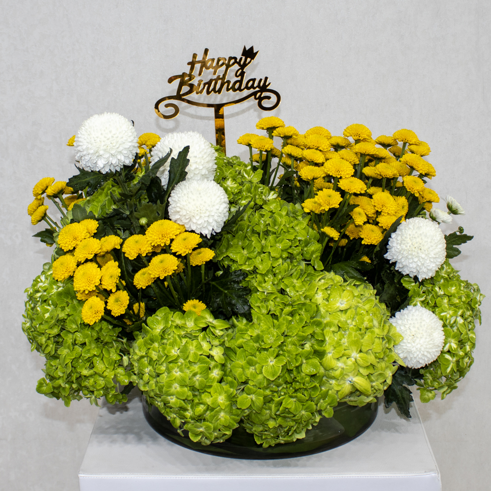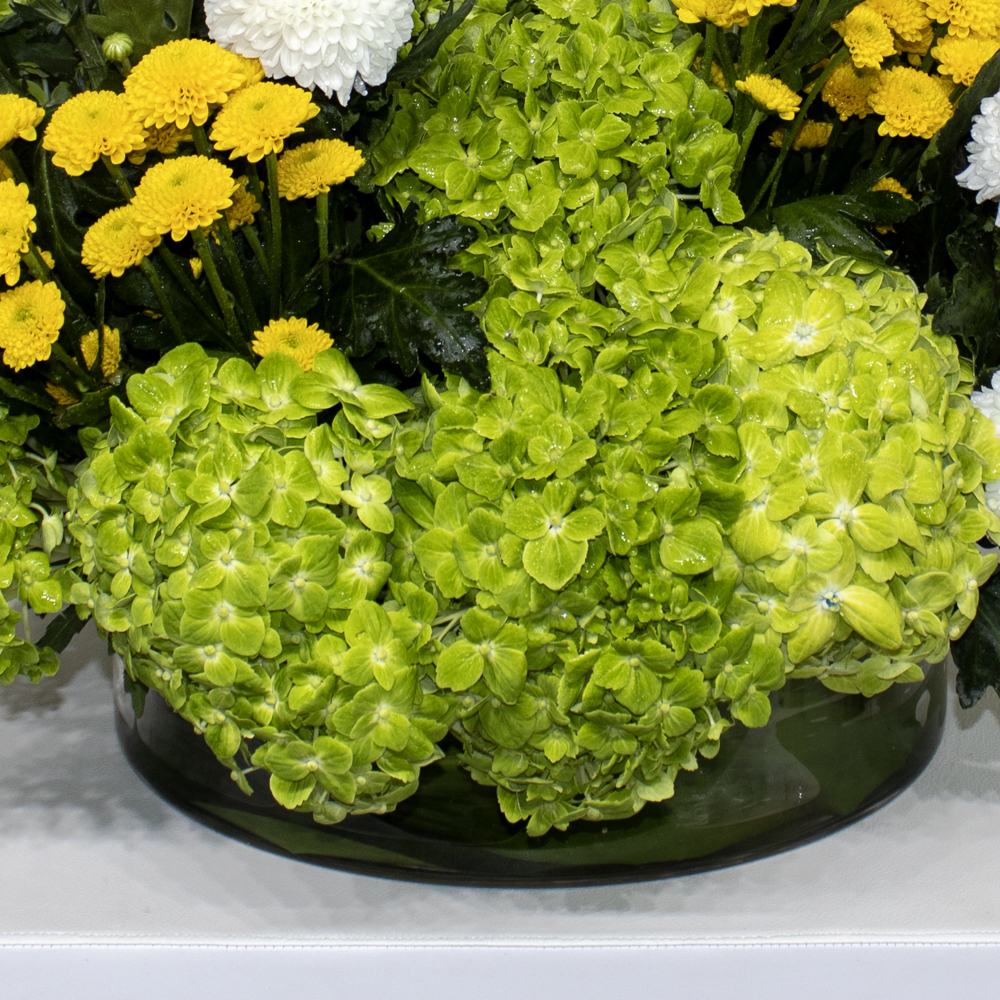 تحتوي هذه الباقة على زهور الهايدرينجا والكريز، مرتبة بشكل جميل في فازة.