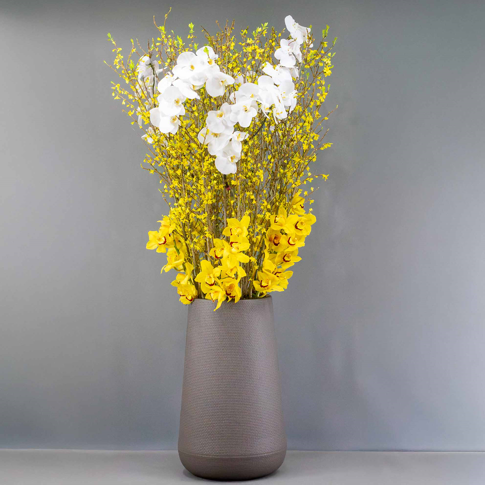 هذه الباقة تحتوي على نباتات الأوركيد البيضاء منسقة بشكل جميل بداخل فازة مغلفة.