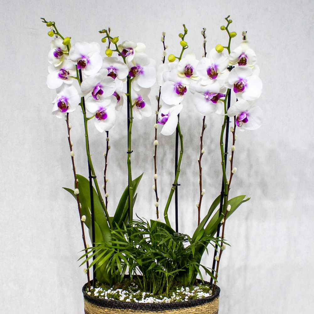وعاء زراعة مصنوع يدويًا مليء بنباتات الأوركيد ذات الشفاه الحمراء.
