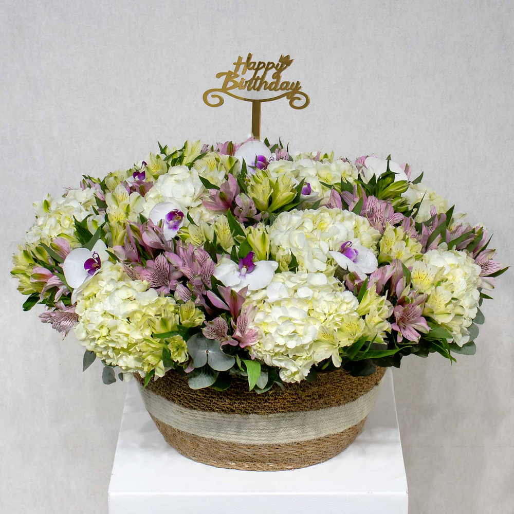 فازة جلدية على نباتات الأوركيد الوردية وزهور الكوبية الوردية الداكنة.