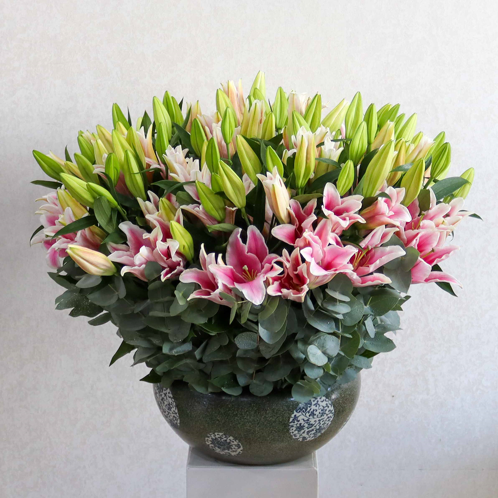 فازة عالية تحتوي على نباتات الأوركيد ذات الشفاه الحمراء ونبات الفستق.