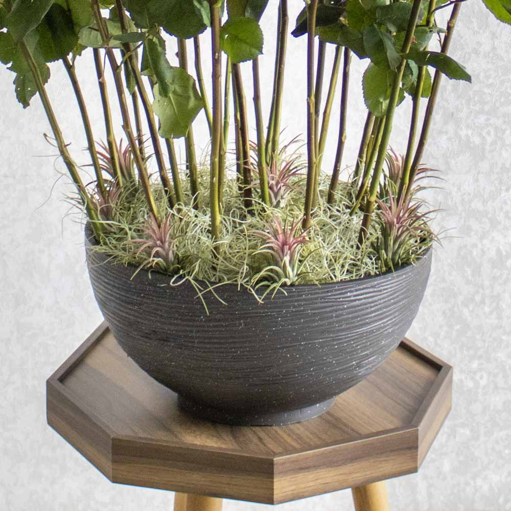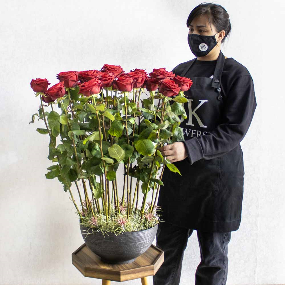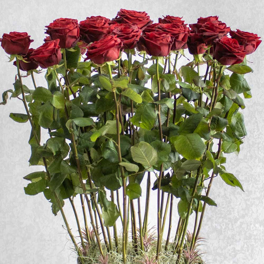 تحتوي هذه المزهرية على ورود حمراء خاصة من نعومي هولاند معطرة وخضراء.
