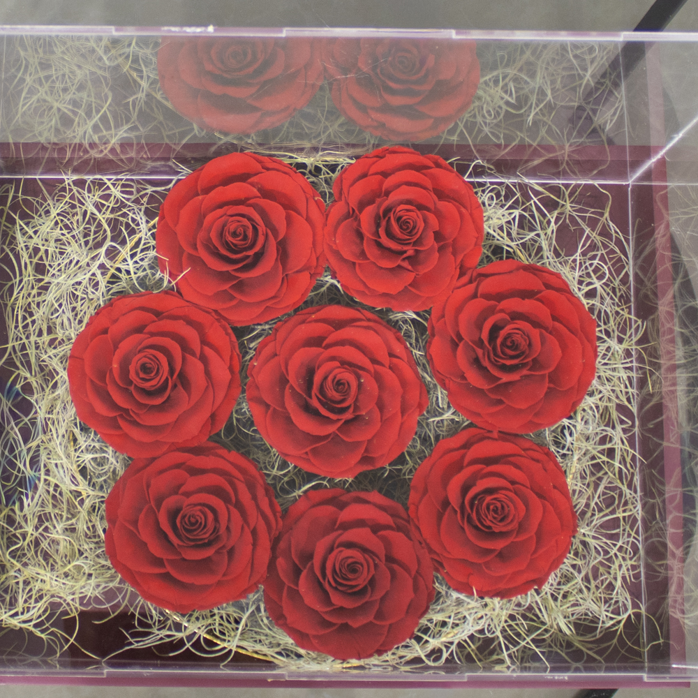 هذا المنتج عبارة عن مجموعة من زهور الجوري الحمراء المحفوظة، مرتبة في أوعية معدنية داخل علبة عرض شفافة. خضعت الورود لمعالجة خاصة للحفاظ على نضارتها لفترة طويلة، غالباً ما تدوم لأكثر من عام.