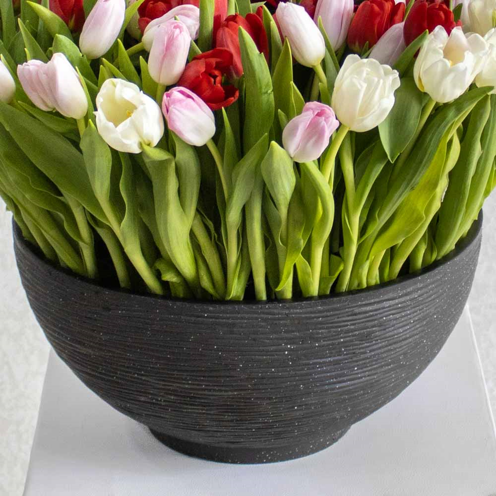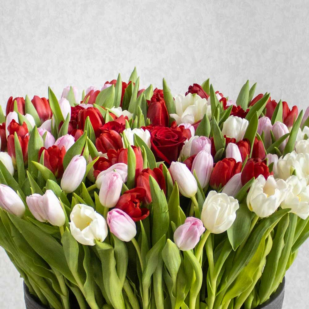 تحتوي هذه الباقة على زهور التوليب الحمراء والوردية والبيضاء الموضوعة في مزهرية.