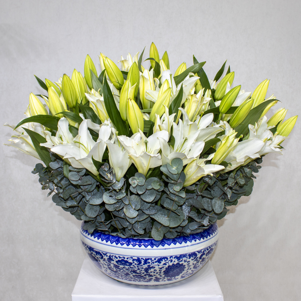 تحتوي هذه الباقة على نباتات الأوركيد الأرجوانية مرتبة بشكل جميل في مزهرية خزفية كبيرة.