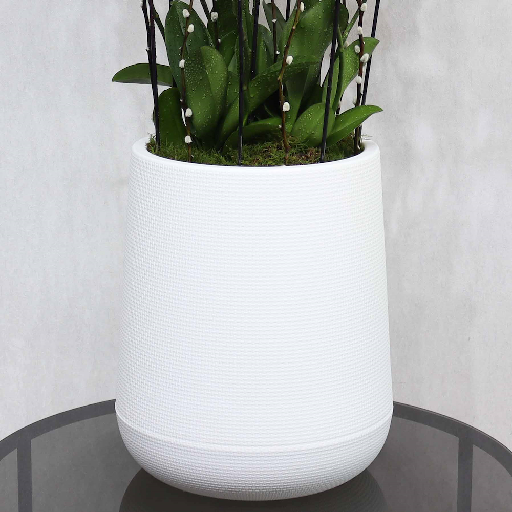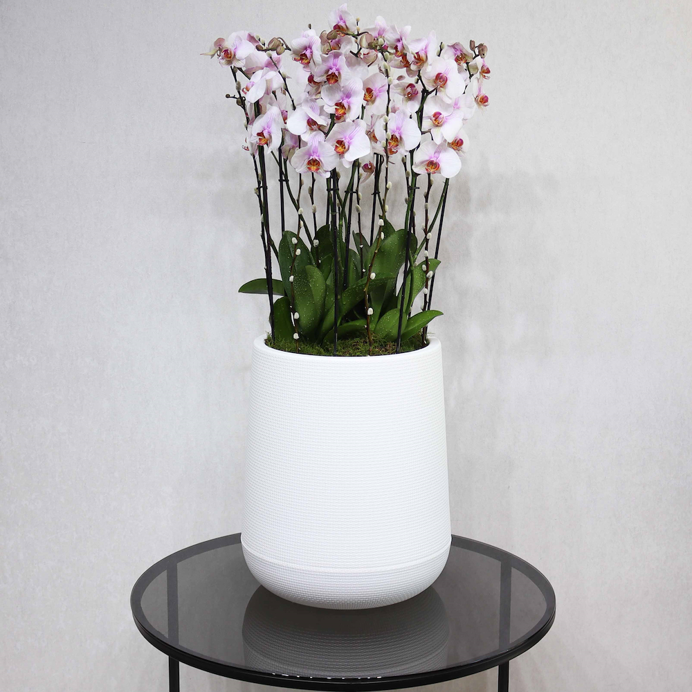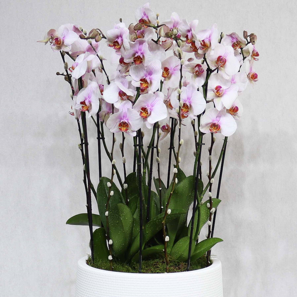 هذه الفازة العالية مليئة بنبات الأوركيد ذو الشفاه الحمراء.