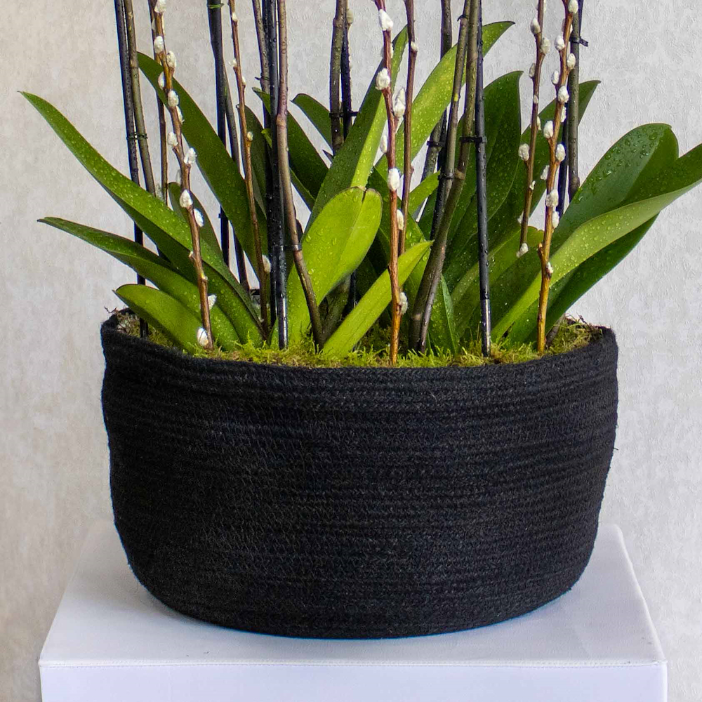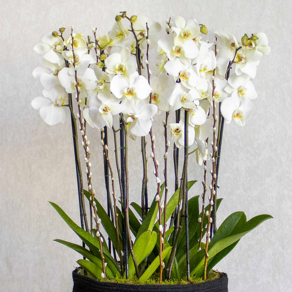 تحتوي هذه الباقة على نباتات الأوركيد البيضاء مع أعواد قطنية مرتبة بشكل جميل في مزهرية سوداء مستديرة.