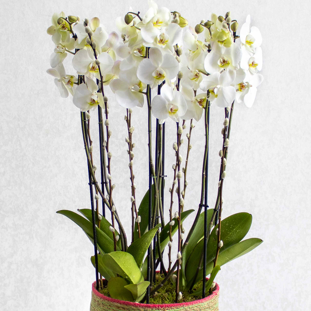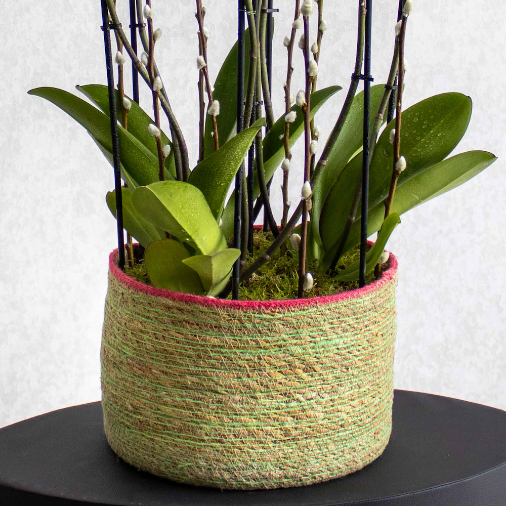 تحتوي هذه السلة المصنوعة يدويًا على نباتات الأوركيد ونباتات الإشفيريا الخضراء.