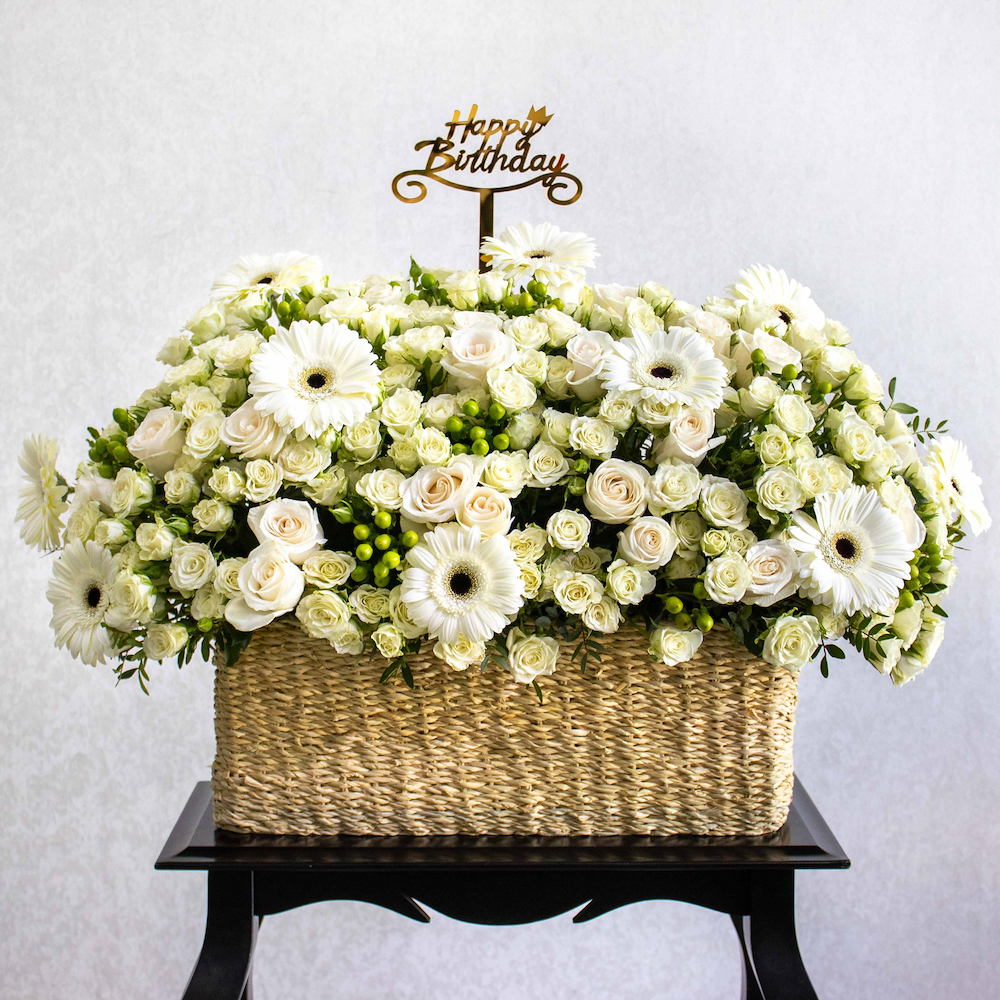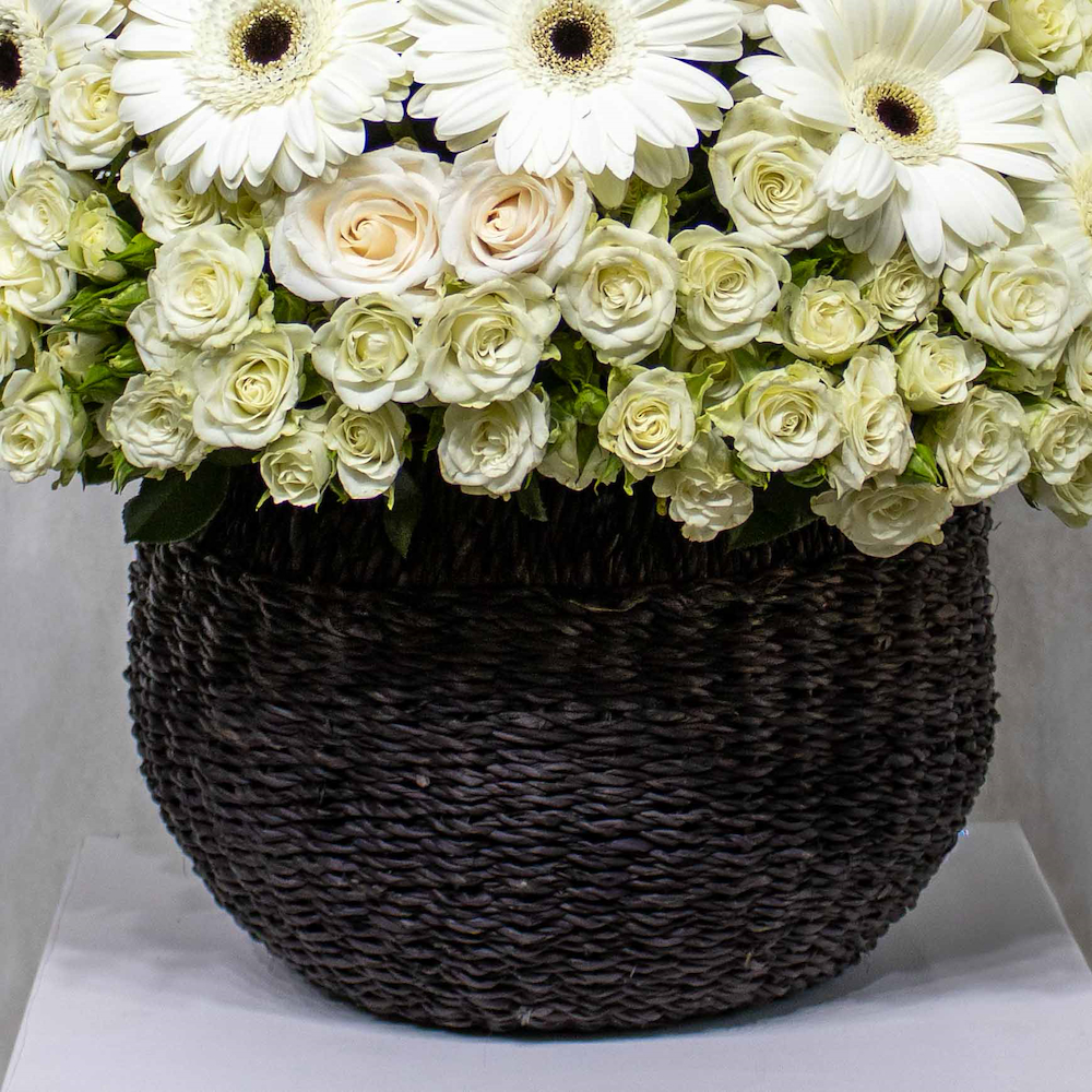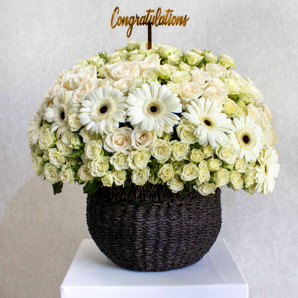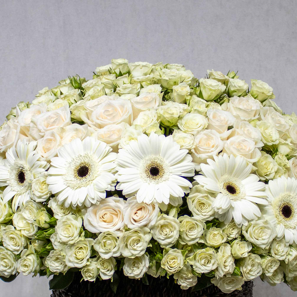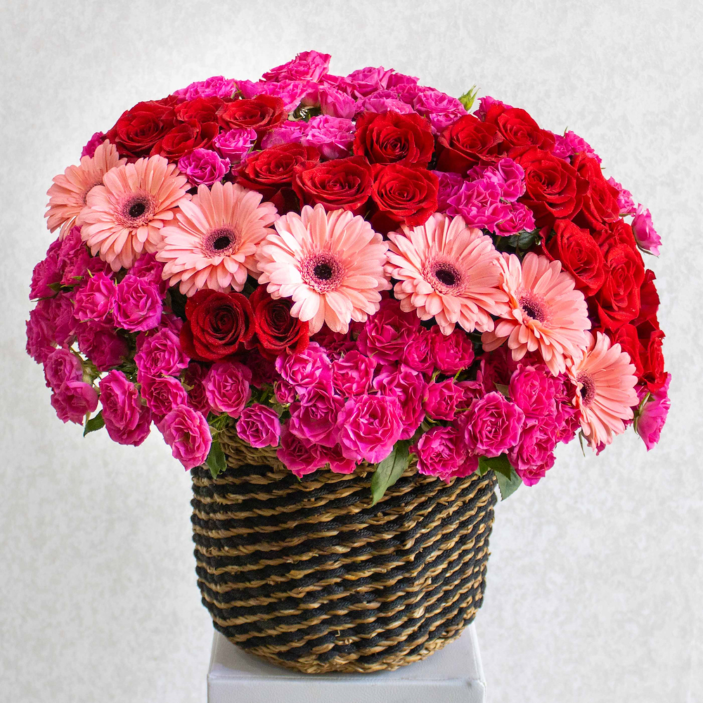 فازة مرتبة بشكل جميل بزهور الجيربيرا، الجوري والبيبي جوري.