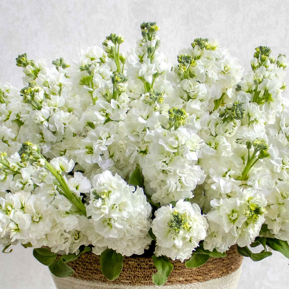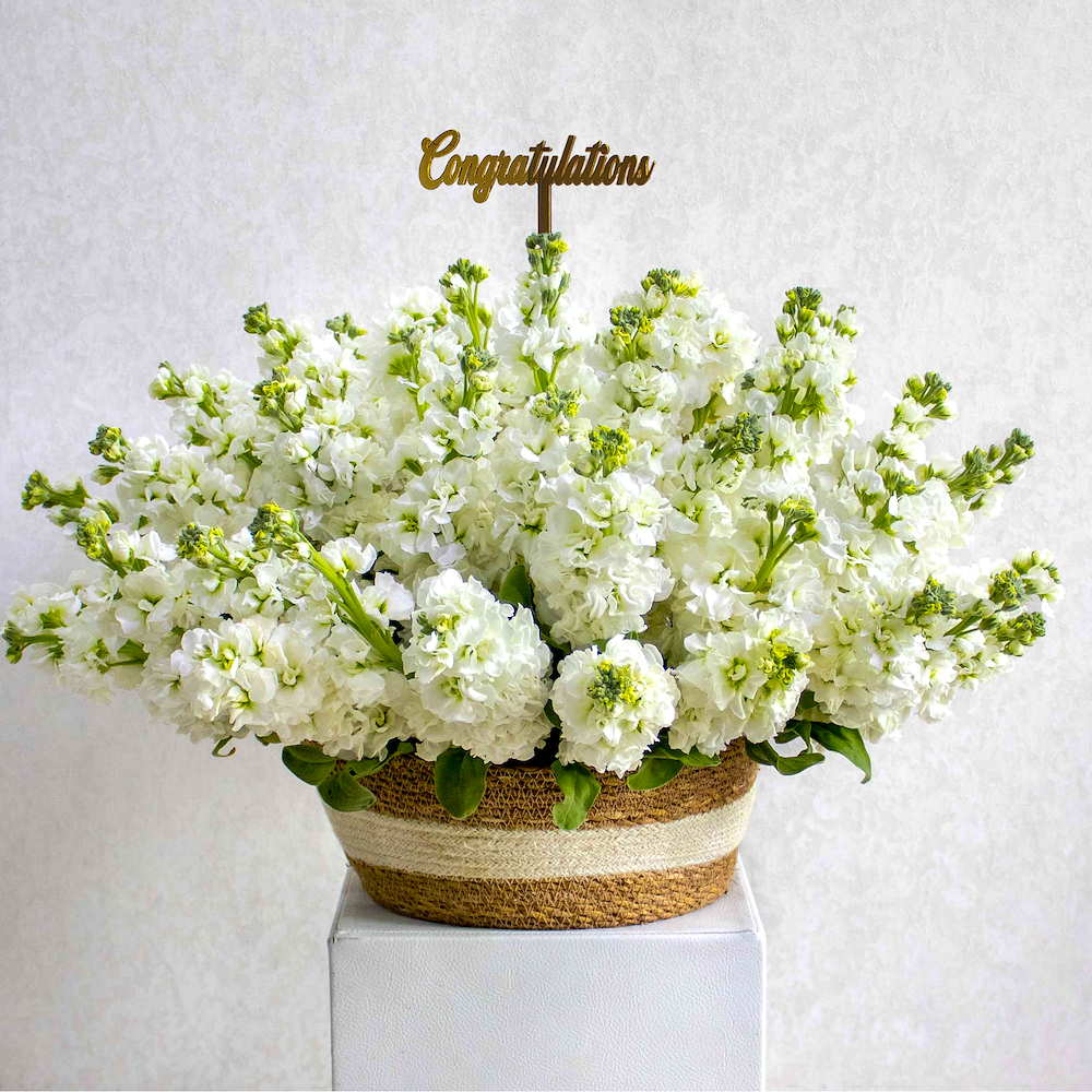 تحتوي هذه الباقة على زهور الماتثيولا البيضاء المرتبة بشكل جميل في مزهرية مصنوعة يدوياً.