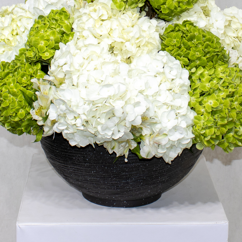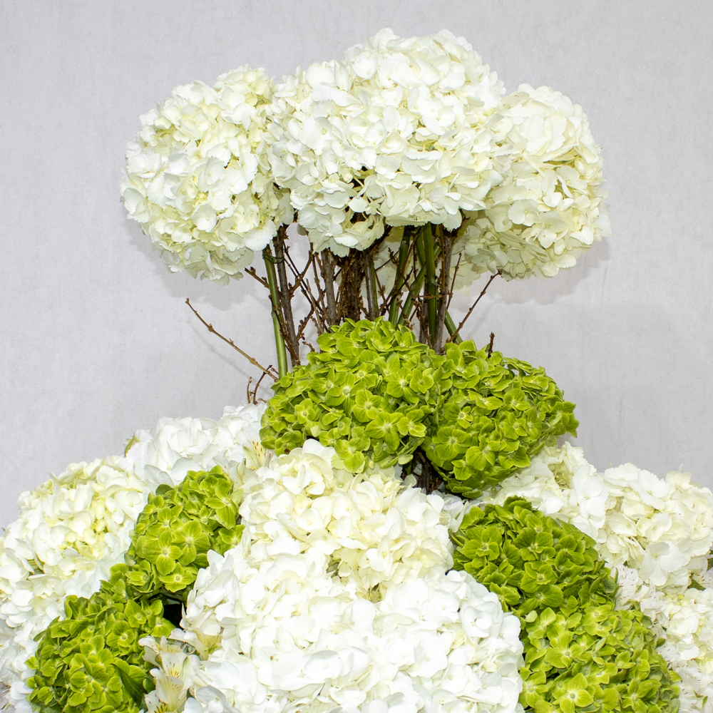 تحتوي هذه الباقة على زهور الكوبية البيضاء والخضراء مرتبة بشكل جميل في فازة.