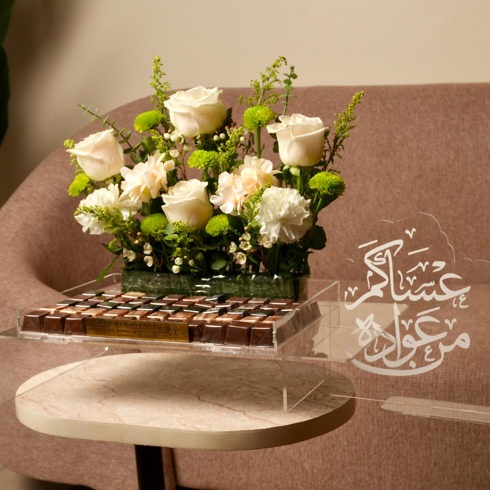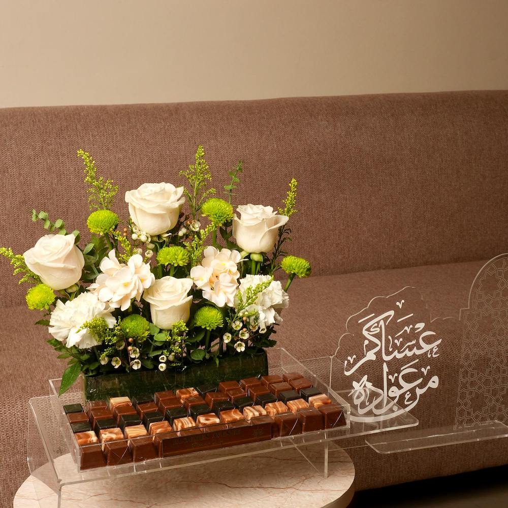 صينية تحتوي على زهور الجوري، الهايدرينجا، الكارنيشن والكريز، مع 55 قطعة من الشوكولاتة.