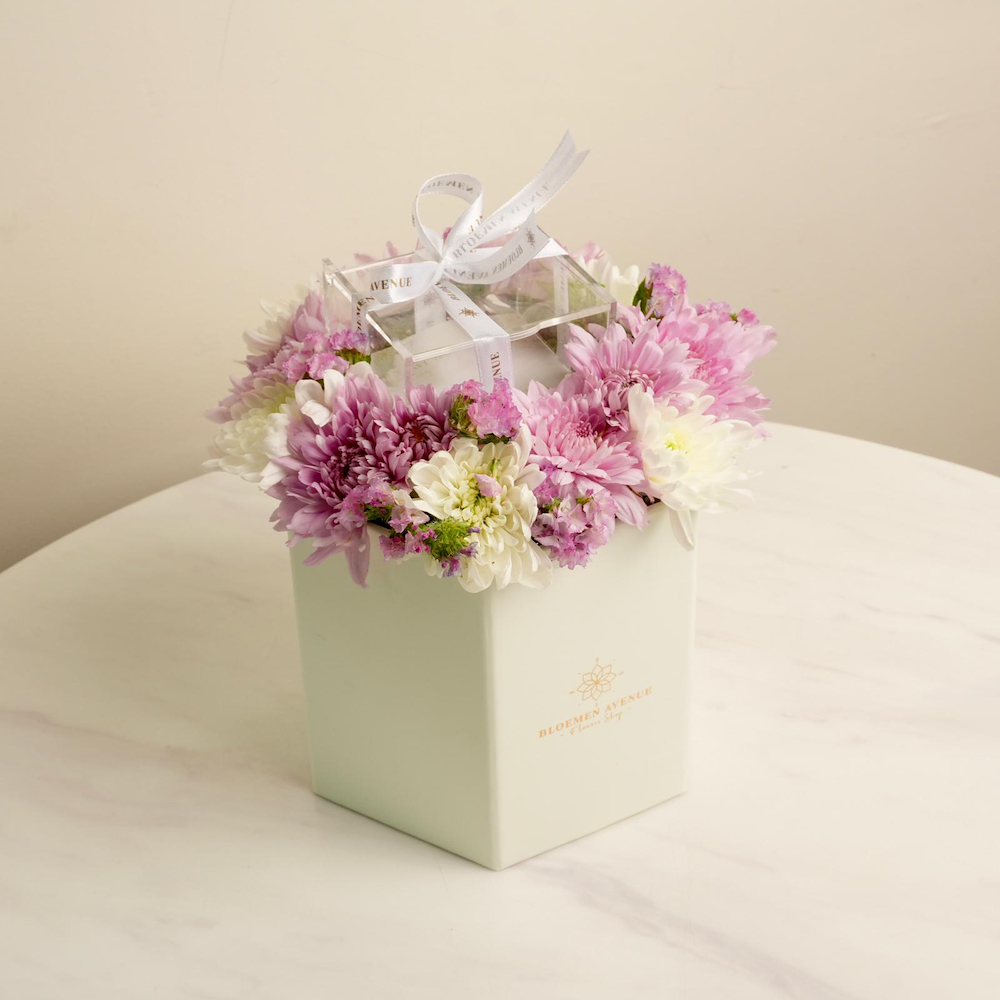 هذه العلبة تحتوي على زهور الكريز مع علبة من الأكريليك للهدايا النقدية. ملاحظة: النقود غير مشمولة.