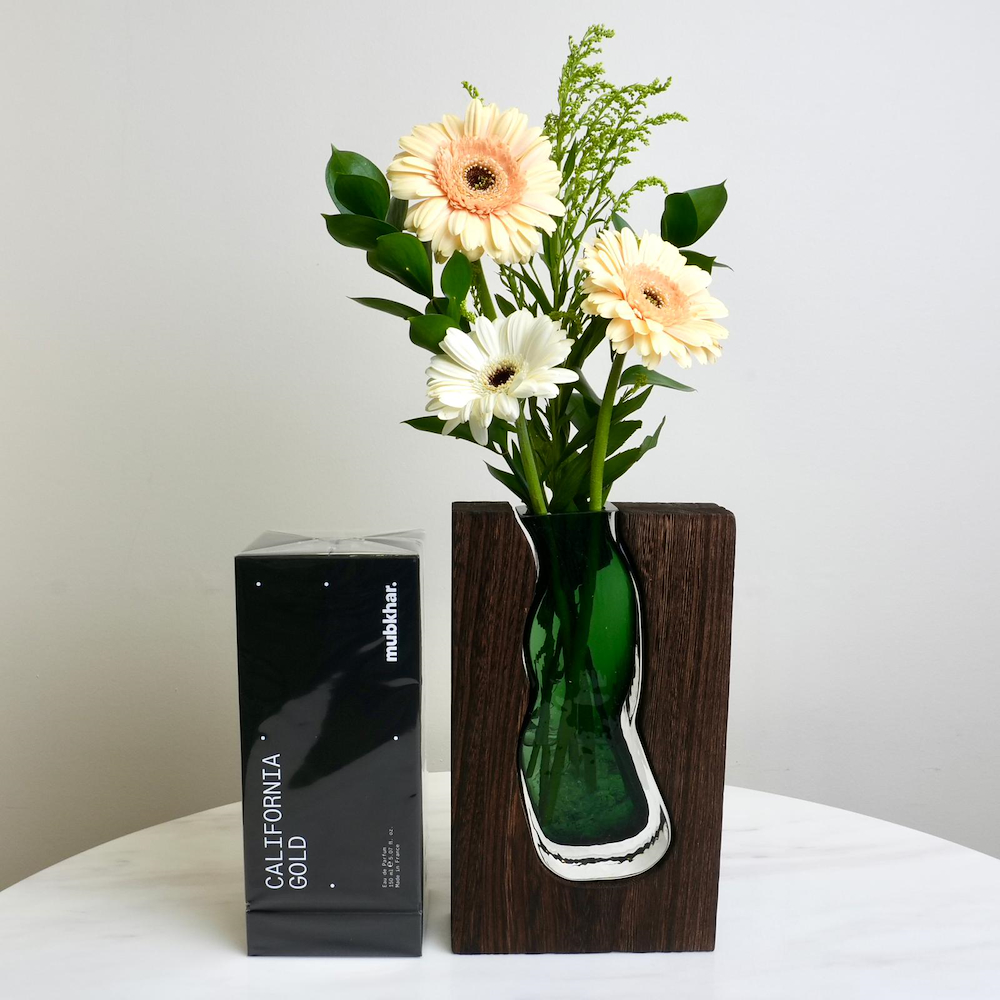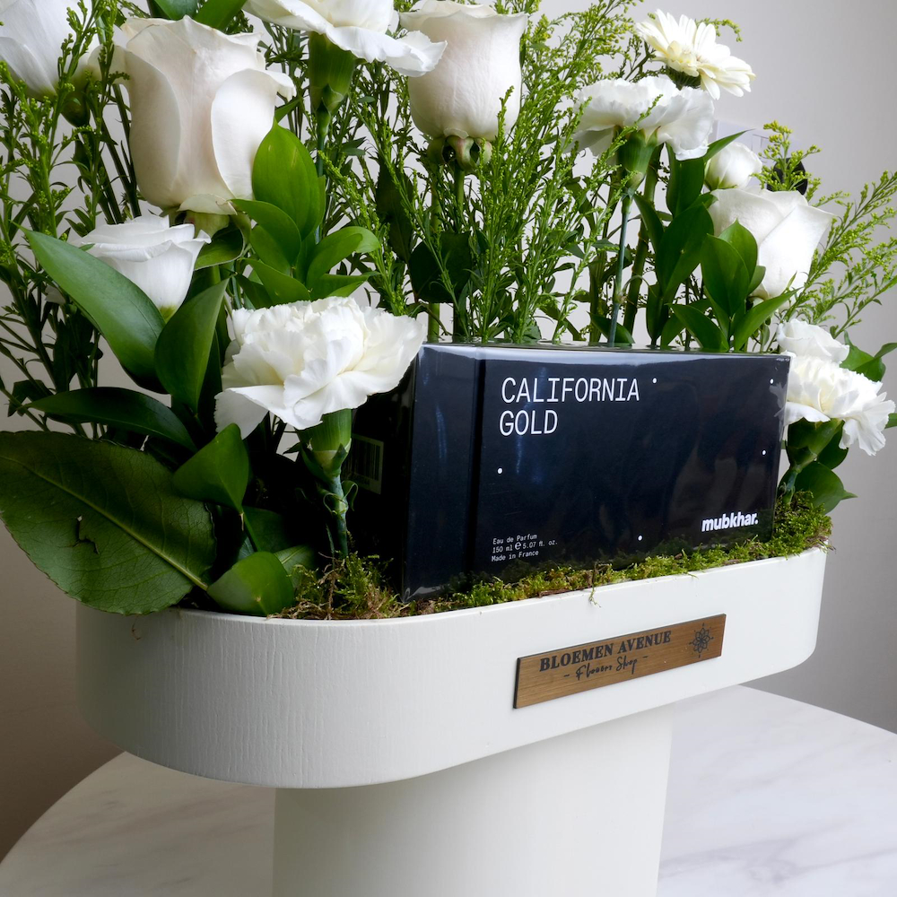 تنسيق فاخر من زهور الجوري، البيبي جوري، الجيربيرا والكارنيشن البيضاء الطبيعية والأوراق الخضراء، مرتبة مع عطر California Gold الفاخر من مبخر. مزيج يجمع بين الجمال الطبيعي وعبق العطور المميزة، مثالي للهدايا الأنيقة والمناسبات الخاصة.