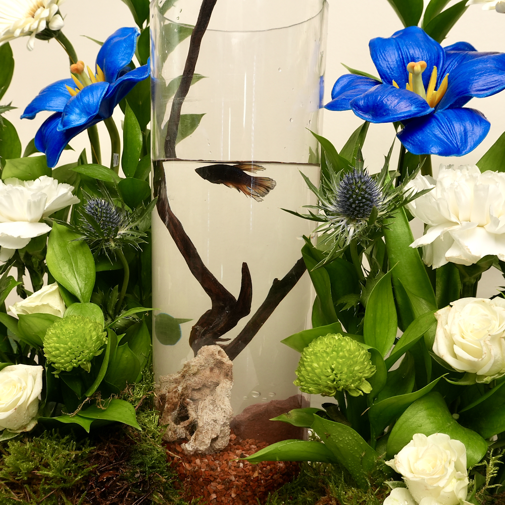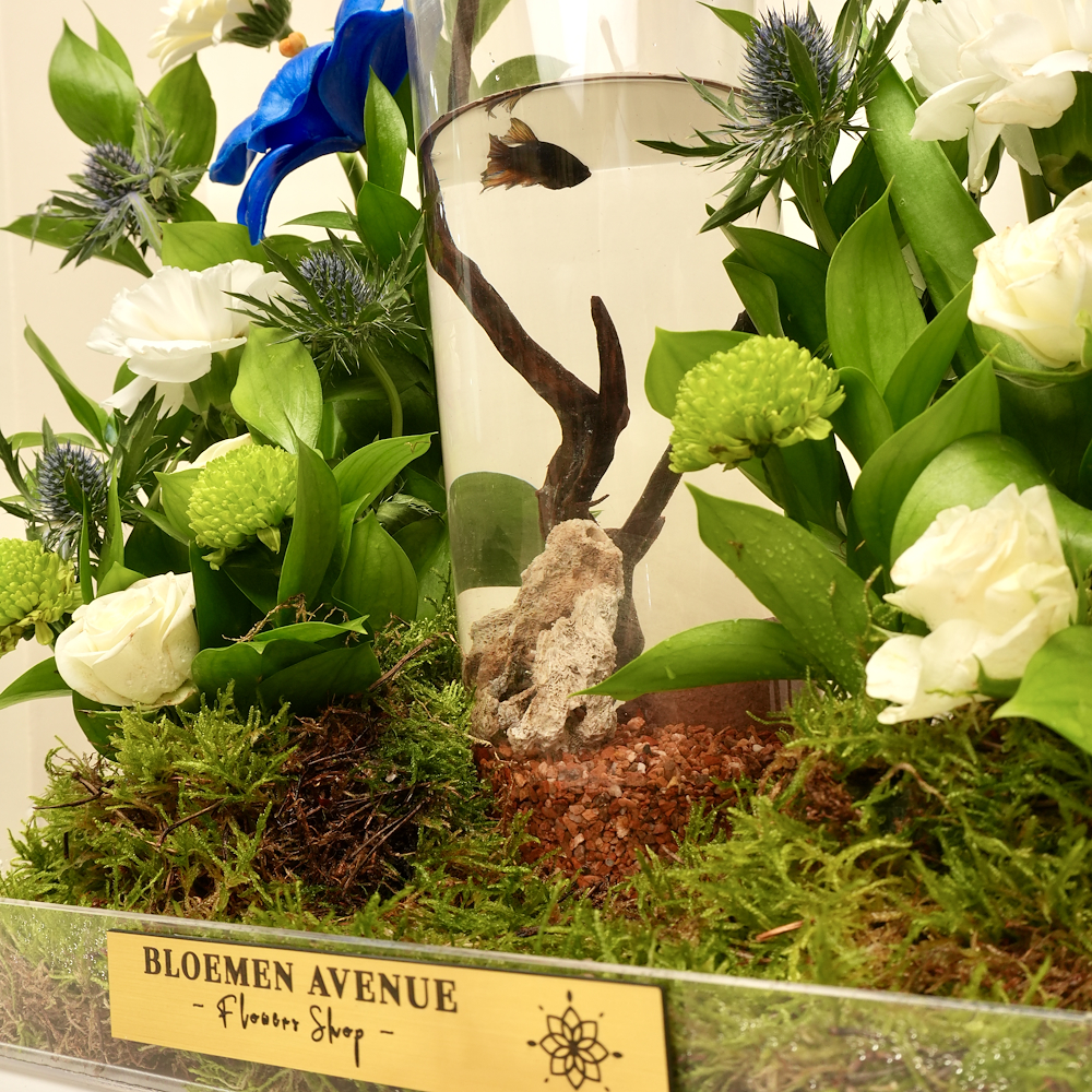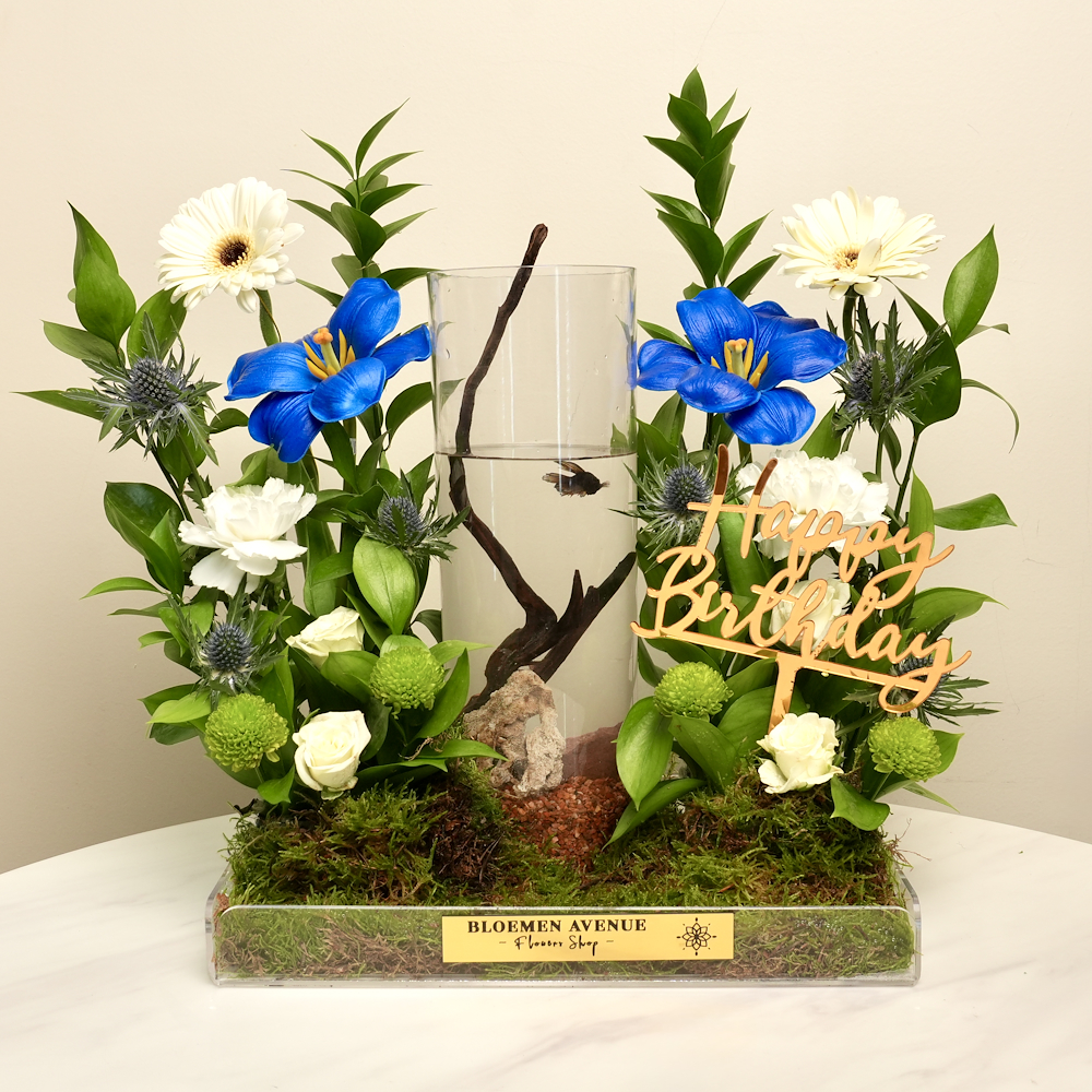 باقة مرتبة بزهور الجيربيرا، البيبي جوري، التوليب، الكريز والكارنيشن مع سمكة الفايتر.