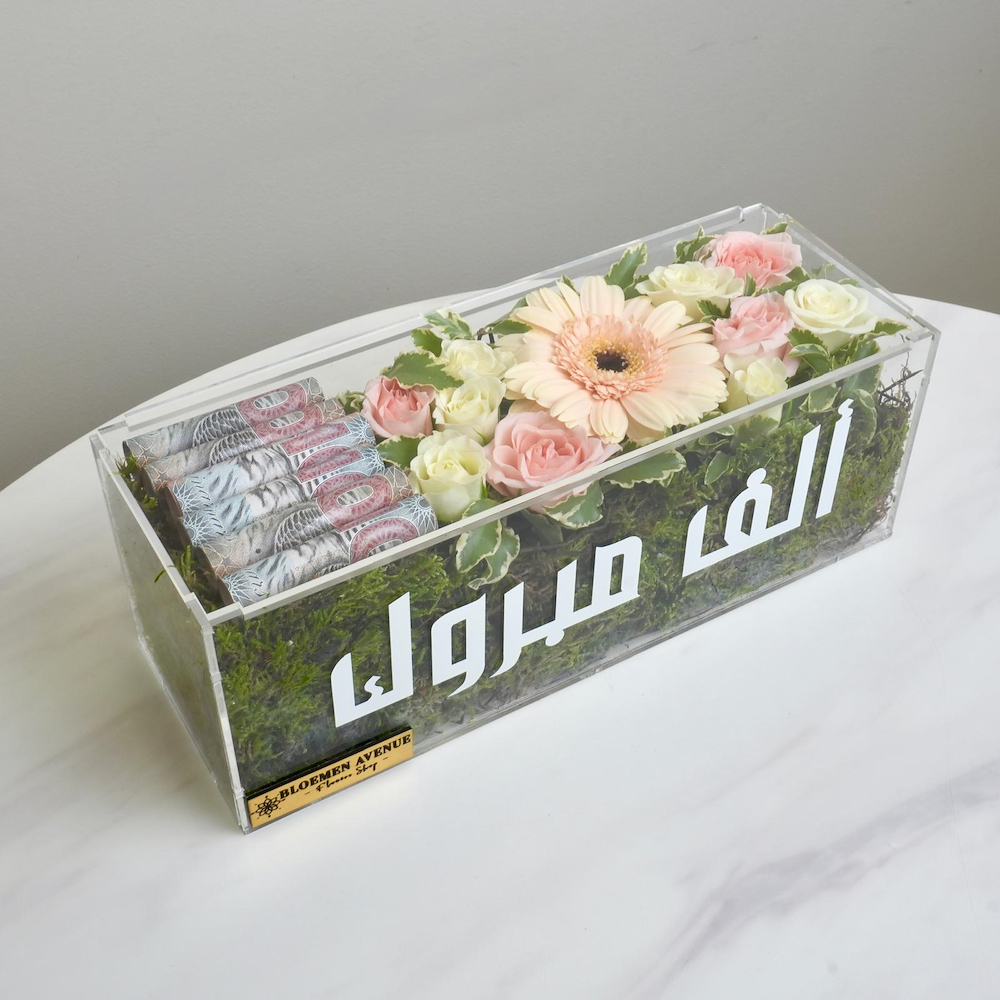 باقة تحتوي على زهور الجوري والجيربيرا، مرتبة بشكل جميل في صندوق. هذا المنتج لا يشمل المال.
