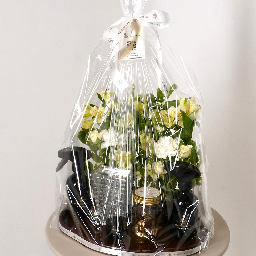 صينية أنيقة مليئة بأزهار الكارنيشن، والسترومريا مع بخور، دهن عود، مسك، 2 مرشات، مبخر، وشوكولاتة.