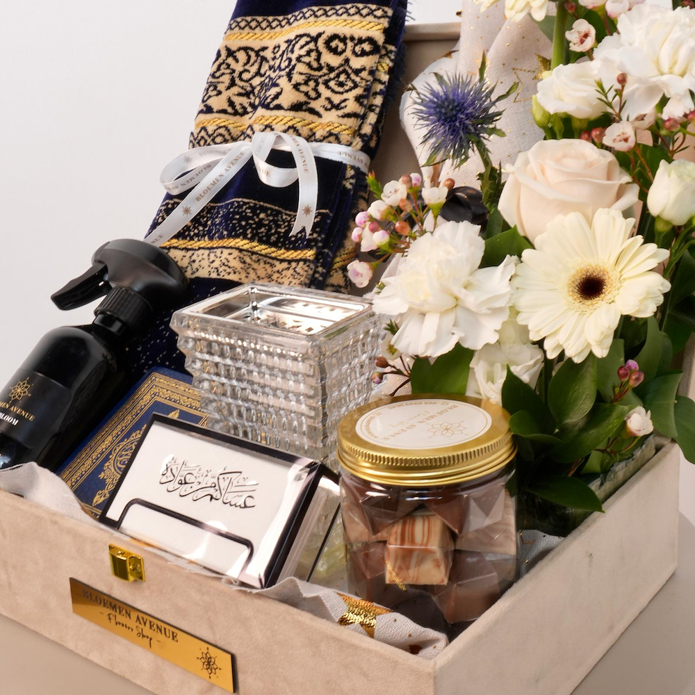 بوكس أنيق مليئ بأزهار الروز، الكارنيشن، والجربيرا مع سجادة صلاة، قرآن، شوكولاتة، فيمتو، بوكس مناديل، مبخر، وبخاخ.
