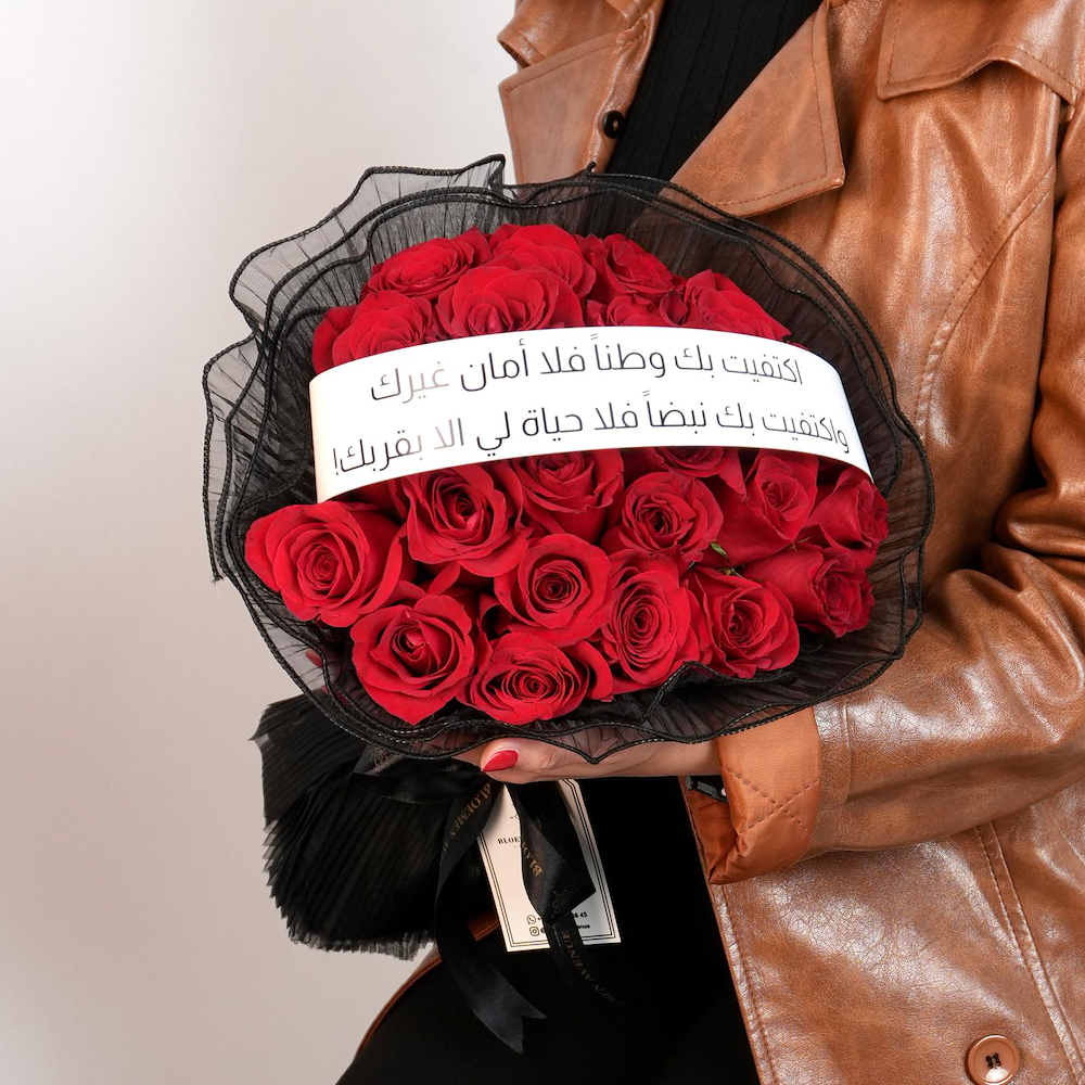 باقة يد تحتوي على 25 من أزهار الجوري باللون الاحمر.