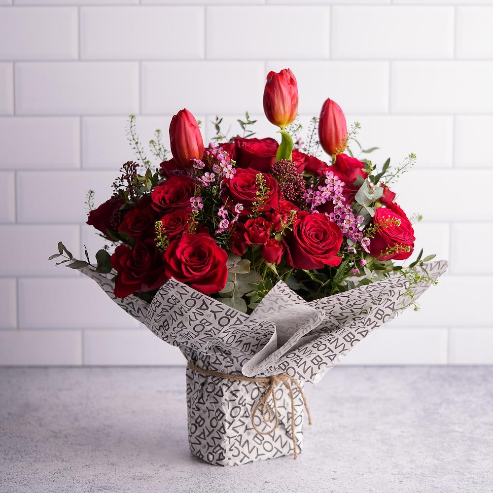 باقة يد تحتوي على زهور جوري حمراء زاهية، مرتبة بشكل جميل لتقديمها بشكل كلاسيكي ورومانسي.