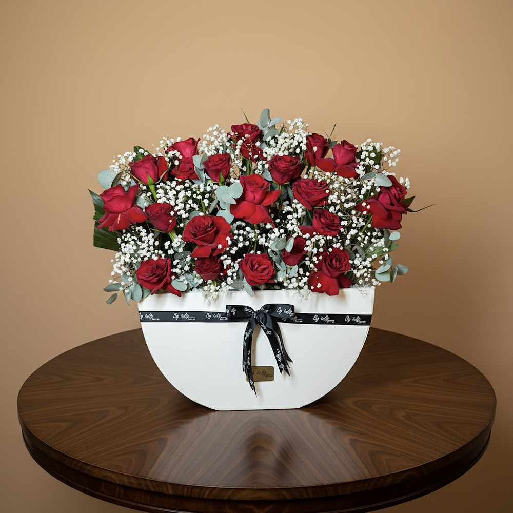 تنسيق ناعم داخل صندوق أكريليك شفاف، يحتوي على مزيج من الجوري والكارنيشن الأحمر فوق طبقة من الطحالب الخضراء الطبيعية. يتوسطه شريط أسود وتغريسة "I Love You" بخط أنيق، بالإضافة الى فازة شوكولاتة.