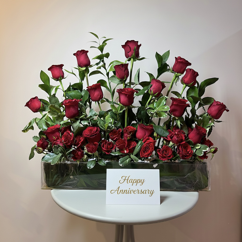 تنسيق ملكي في اكريلك مستطيل يفيض بالروز الأحمر الكلاسيكي والبيبي روز الأحمر. مصمم بارتفاعات متفاوتة ليملأ المكان بالرومانسية، مع بطاقة "Happy Anniversary".