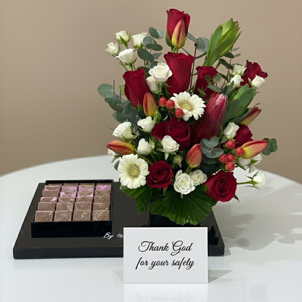 تنسيق كلاسيكي يجمع بين فخامة الروز الأحمر ونقاء الجربيرا البيضاء، مقدم على قاعدة سوداء أنيقة مع تشكيلة مختارة من الشوكولاتة، ليعبر عن أصدق المشاعر.