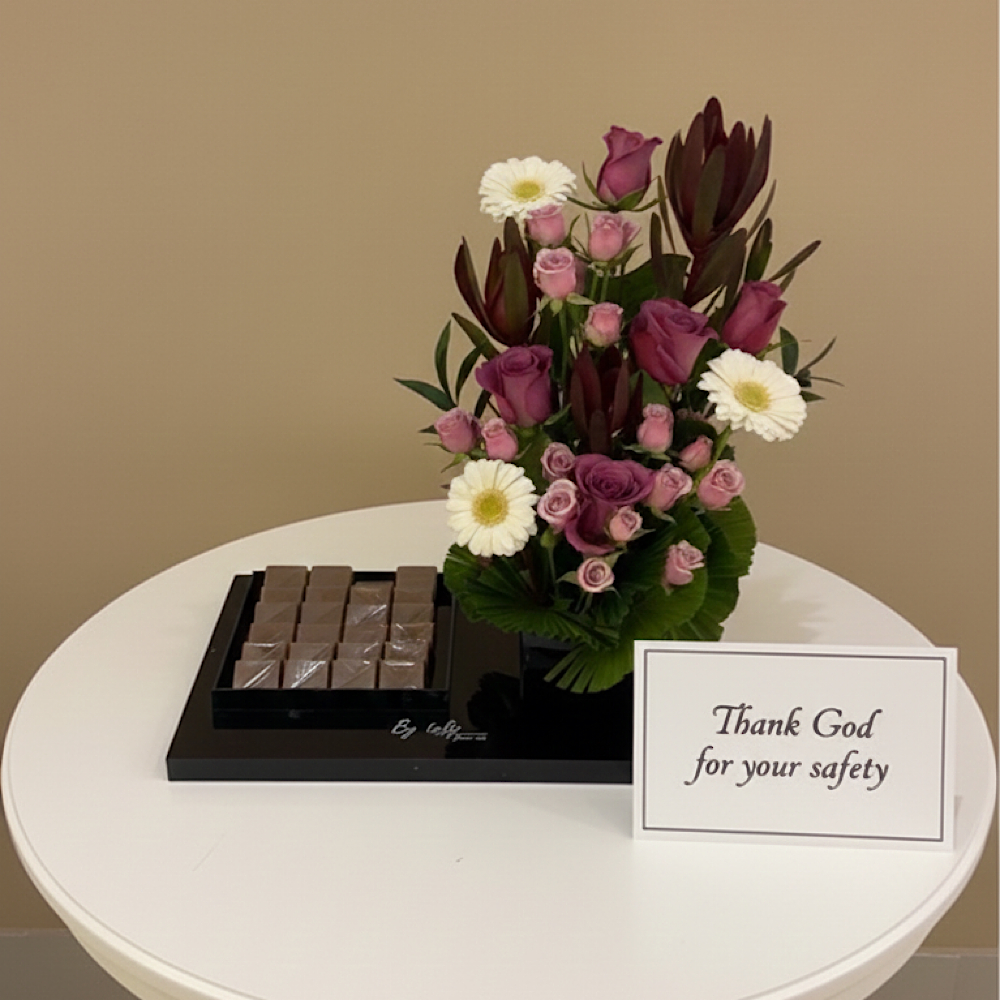يجمع هذا التنسيق بين صندوق شوكولاتة فاخر وتنسيق زهري جانبي يضم وروداً بدرجات البنفسجي والموف مع زهور الجيربيرا البيضاء، مرتبة على قاعدة خضراء دائرية.