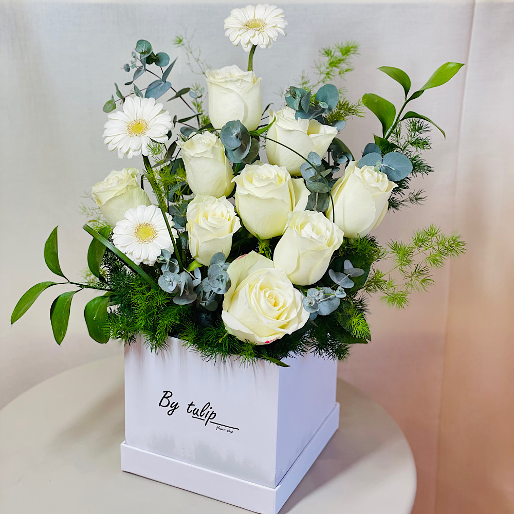تنسيق ملكي فاخر يجمع بين أجود أنواع الجوري الأبيض الكبير وزهور الجيربيرا البيضاء الرقيقة.