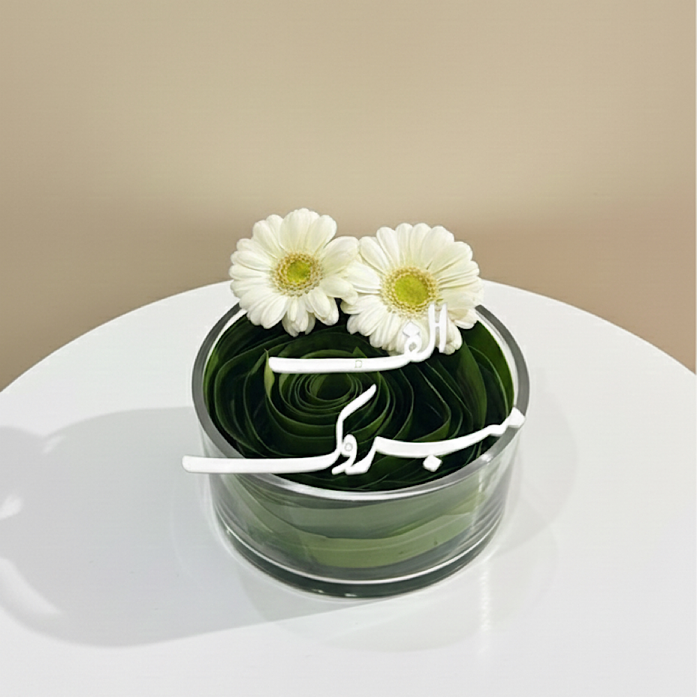 فازة زجاجية دائرية تحتوي على أوراق خضراء منسقة بعناية بأسلوب حلزوني، تعلوها زهرتان من الجربيرا البيضاء مع عبارة "ألف مبروك" بالخط العربي. تصميم بسيط، عميق، ومثالي للهدايا الرمزية.