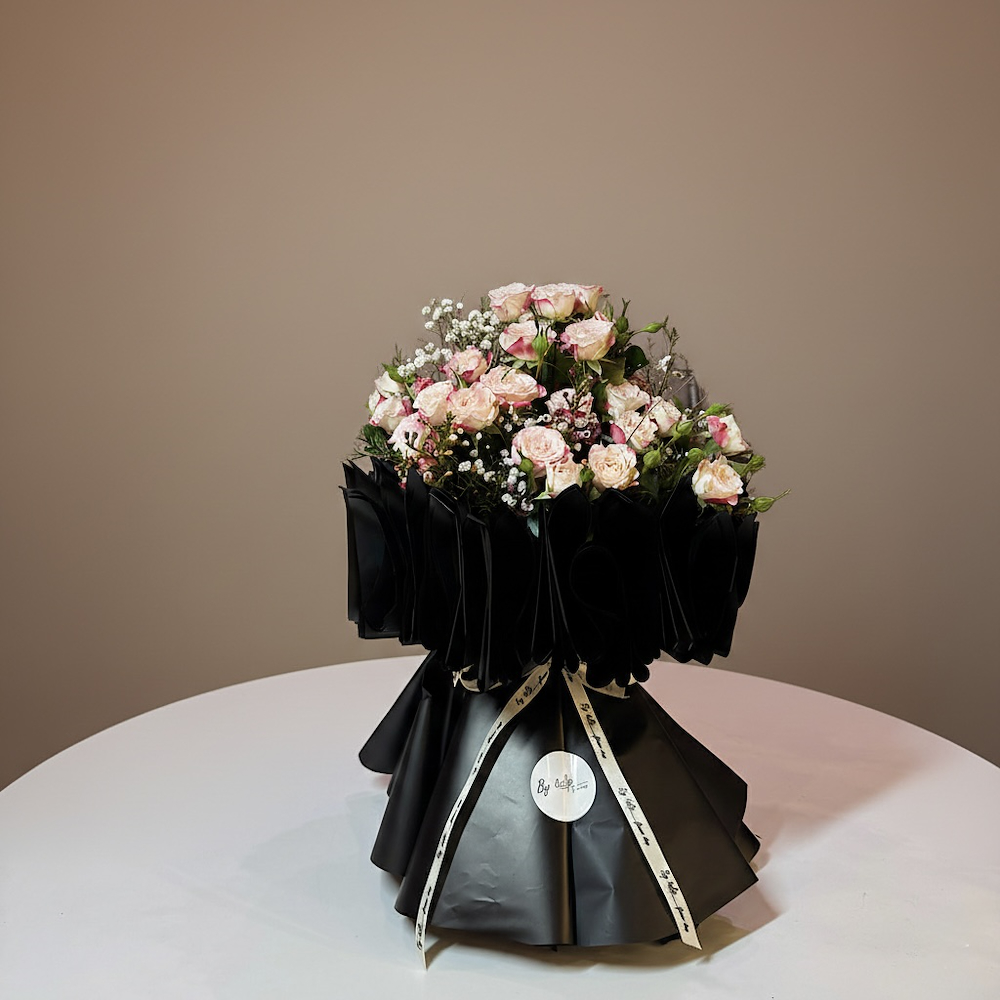 باقة فاخرة تجمع بين الرقة والجرأة، حيث يبرز البيبي جوري بدرجات الوردي وسط تغليف أسود ملكي بتصميم مطوي يعطي حجماً وفخامة إستثنائية. مزينة بشريط المتجر الأبيض المطبوع.