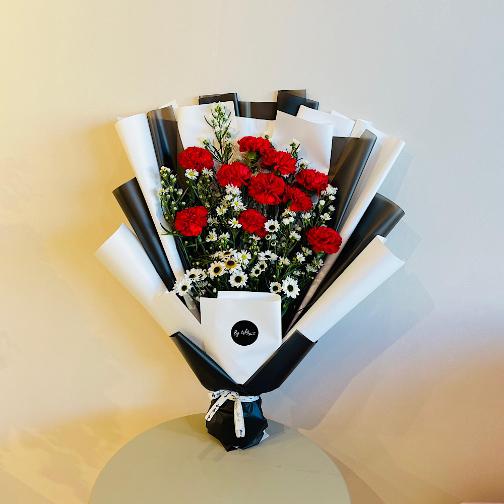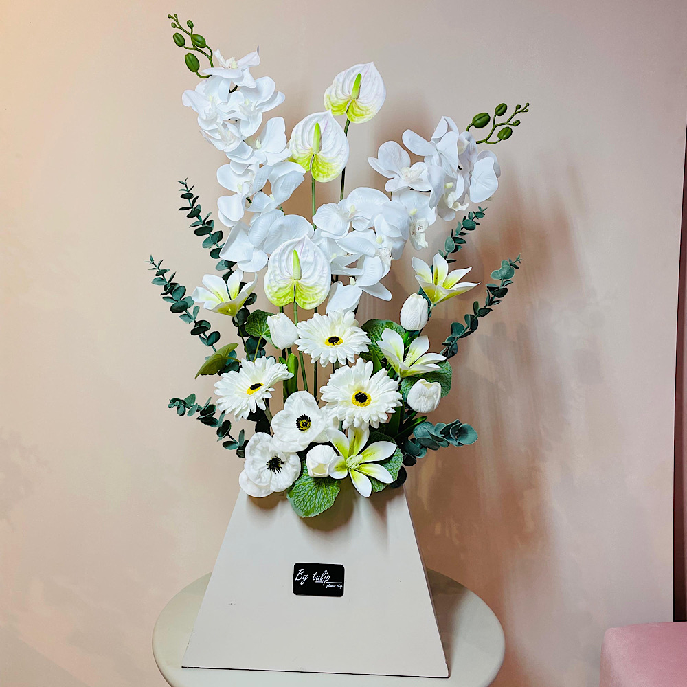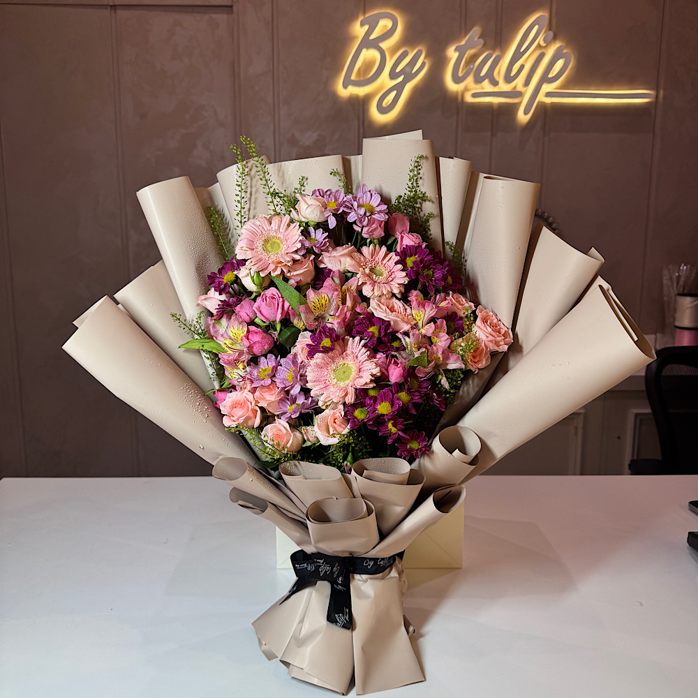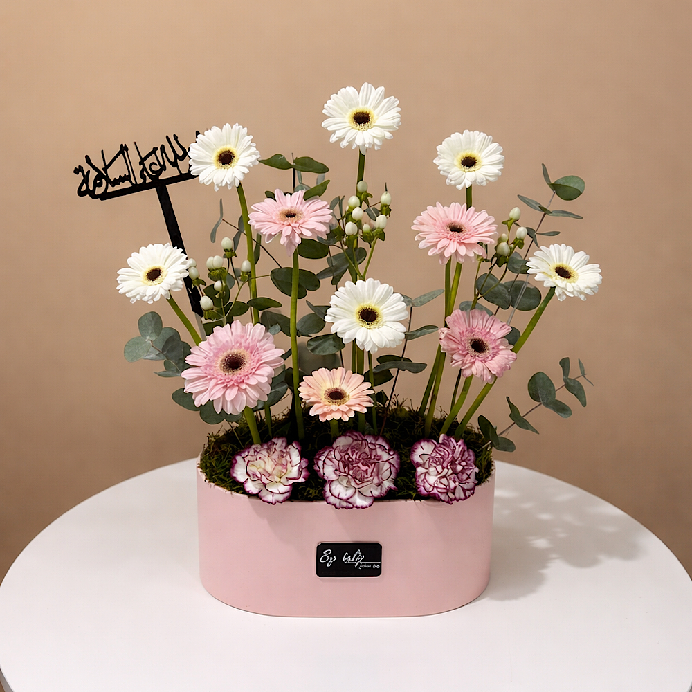 صندوق بيضاوي باللون الوردي الهادئ، يضم مزيجاً متناغماً من زهور الجربيرا باللونين الأبيض والوردي، مع لمسات من زهور الكارنيشن الموشحة بالبنفسجي في الأسفل، يتميز التنسيق بتوزيع طولي وأغصان الأوكالبتوس الخضراء، مع تغريسة "الحمد لله على السلامة.