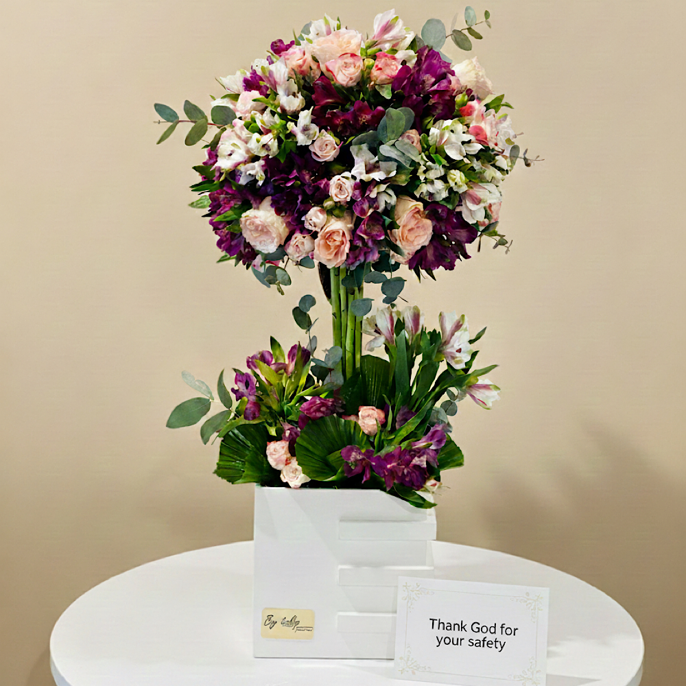 ستاند عمودي بتصميم توبيري يضم كرة كثيفة من أزهار الروز باللون الارجواني والوردي والأبيض، على قاعدة خضراء، مع بطاقة مكتوب عليها الحمدلله عالسلامة.
