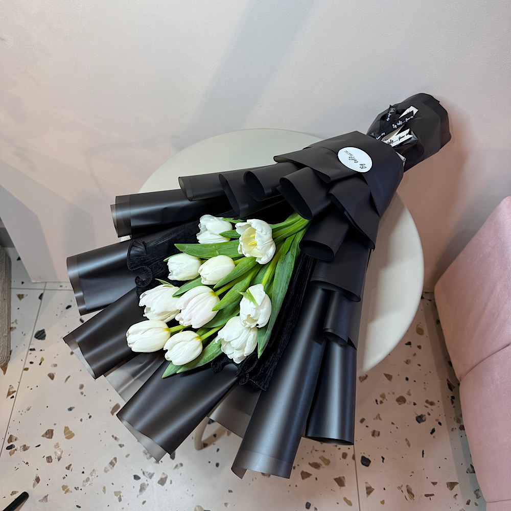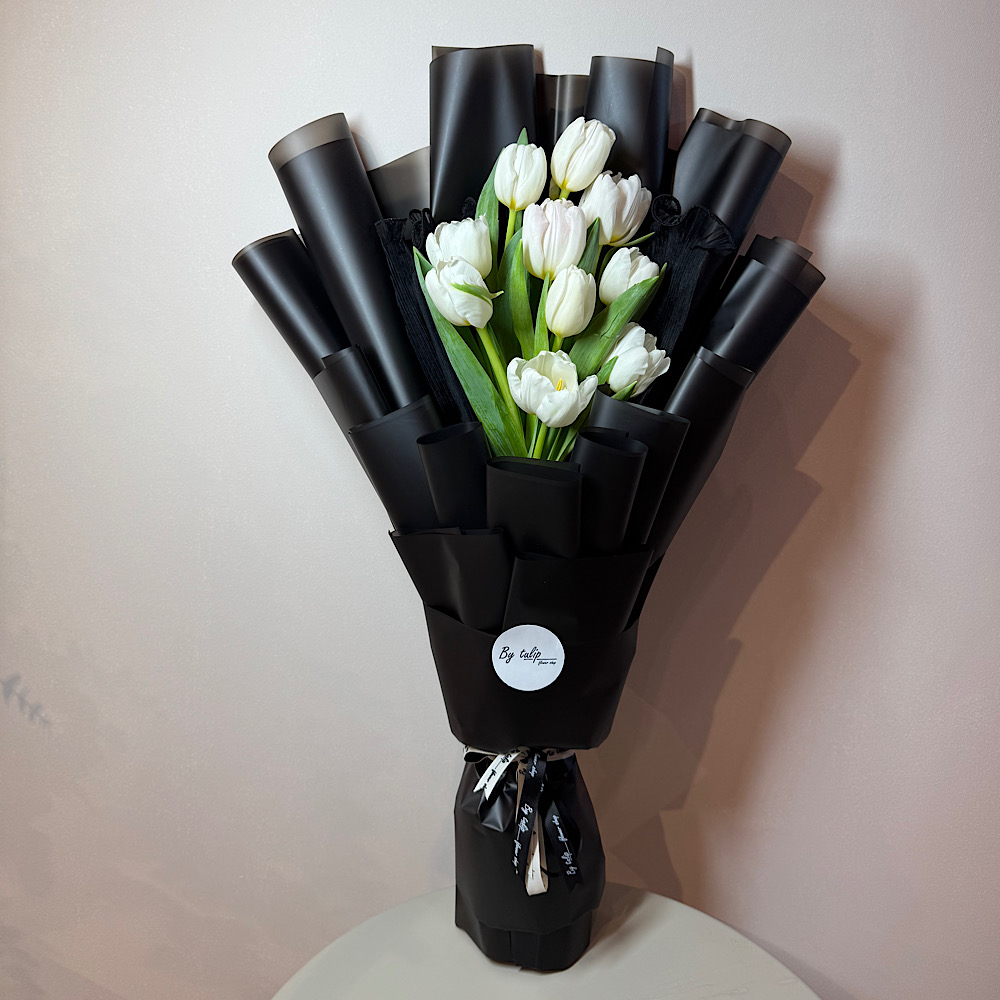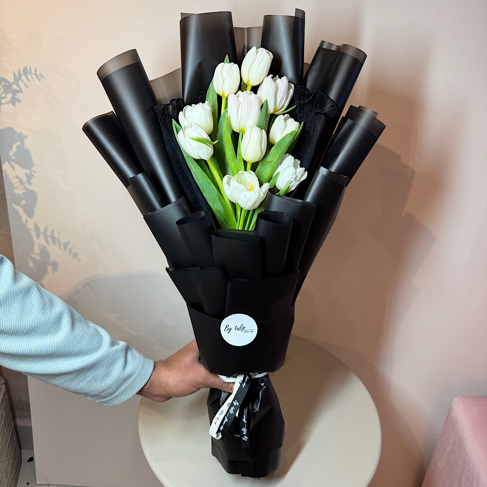 باقة يد رقيقة من التوليب الأبيض، مرتبة بعناية مع جذوع رقيقة وبتلات ناعمة، تنبض بالأناقة والجمال في كل زهرة.