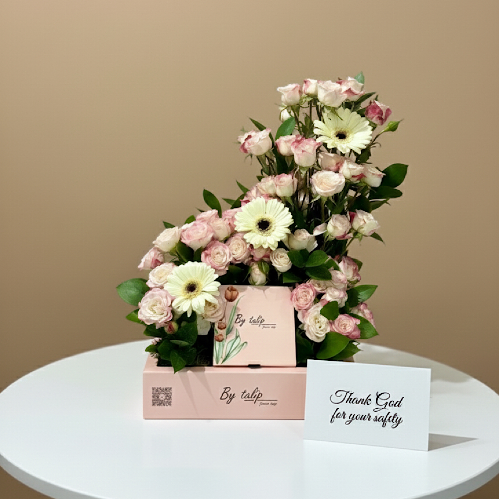 صندوق وردي ناعم يفيض بزهور الروز الصغيرة والجربيرا البيضاء، يأتي مع درج أو علبة داخلية مخصصة للشوكولاتة، مثالي للإهداء في المناسبات السعيدة.