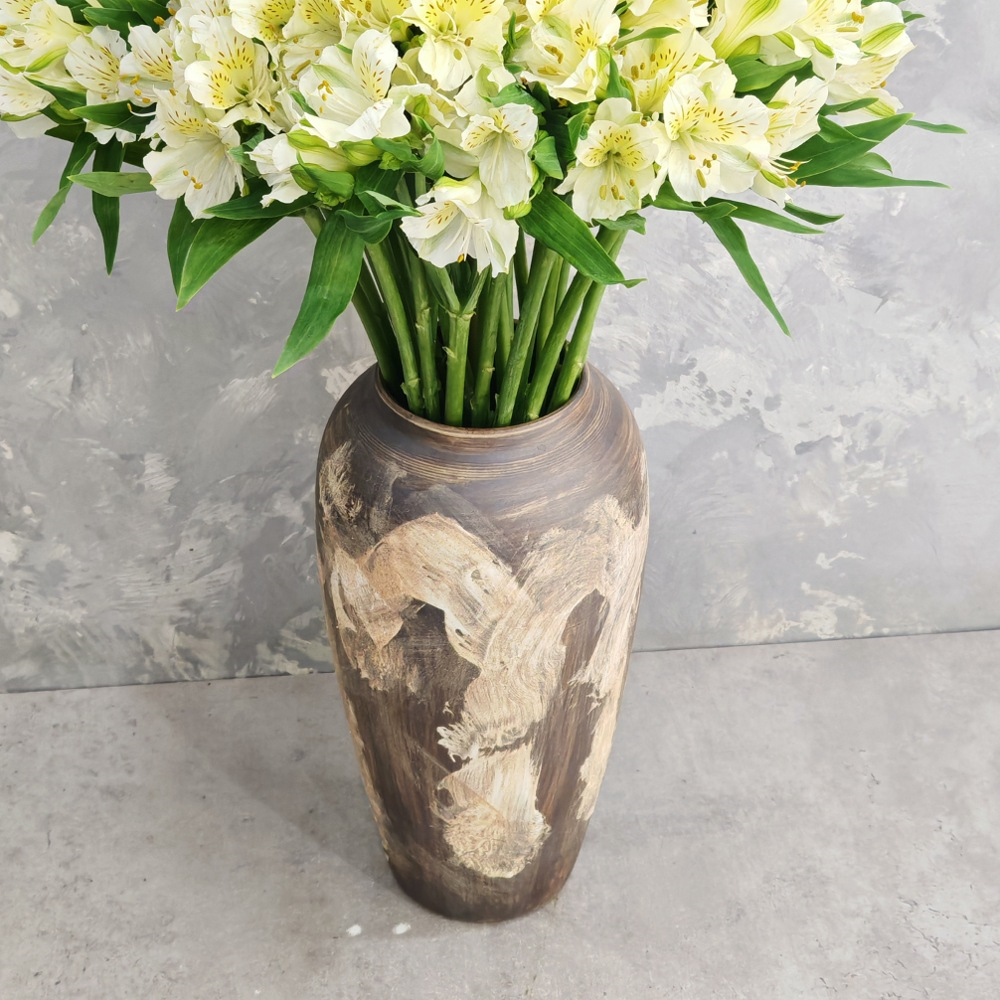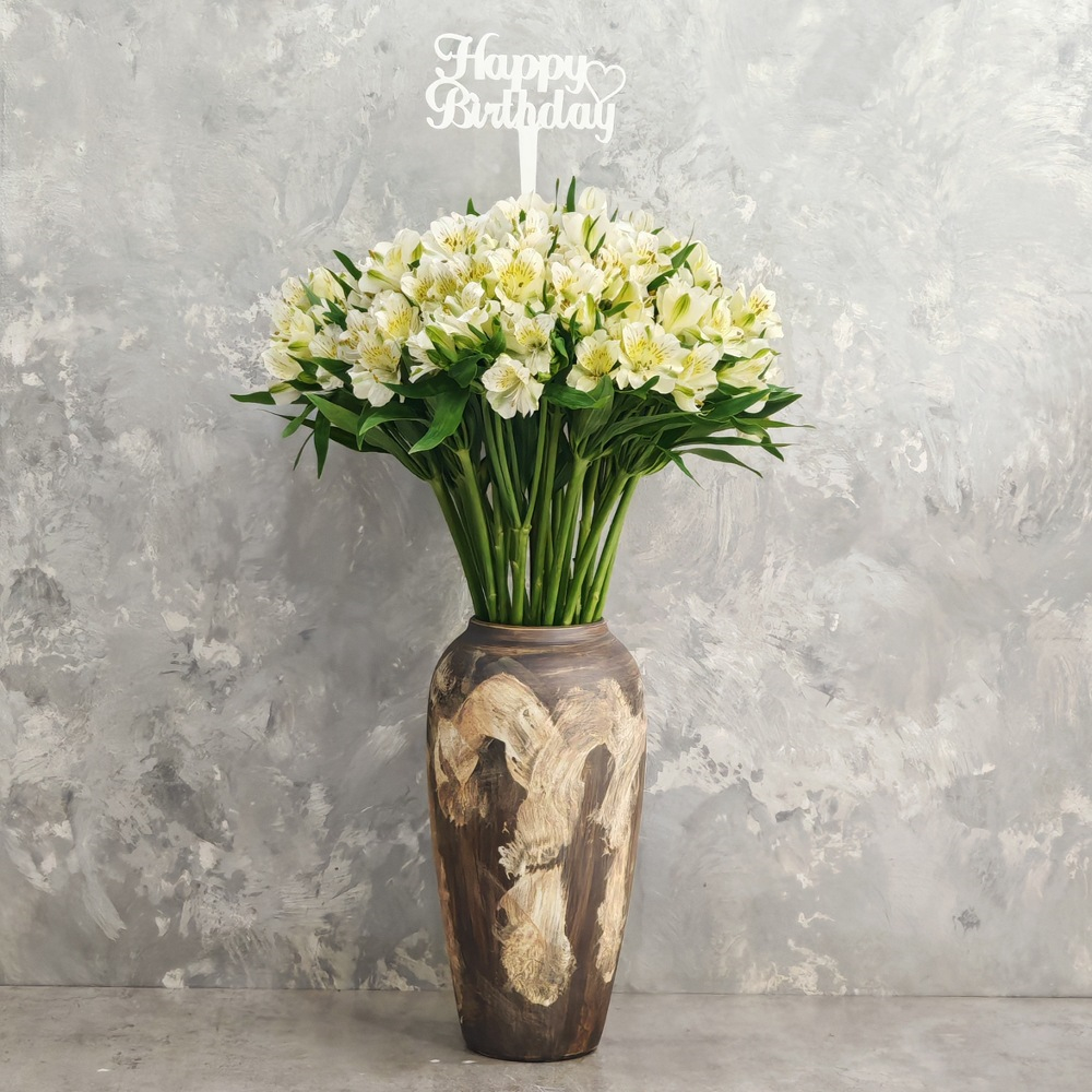 باقة تحتوي على زهور الألستروميريا البيضاء، مرتبة بشكل جميل في فازة.