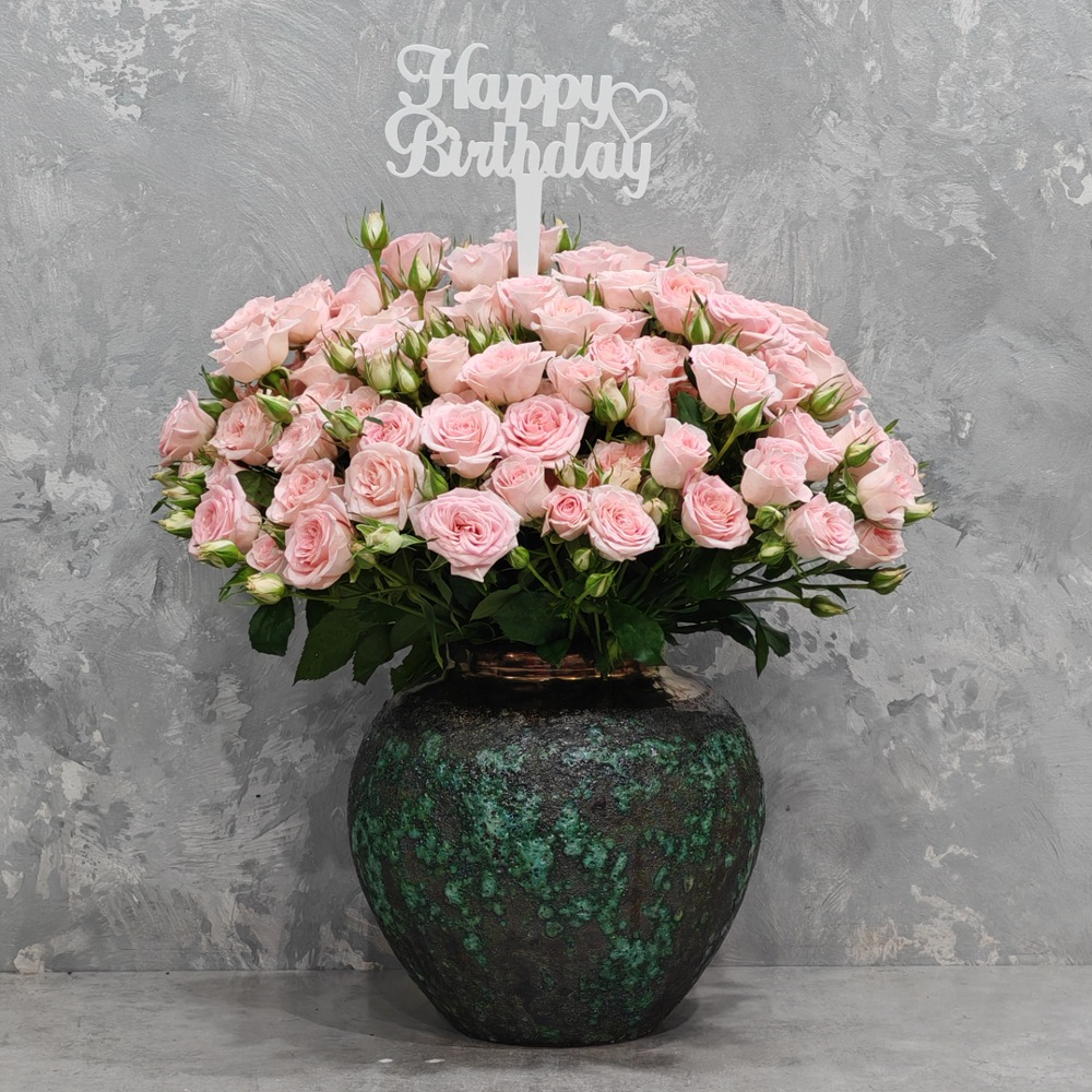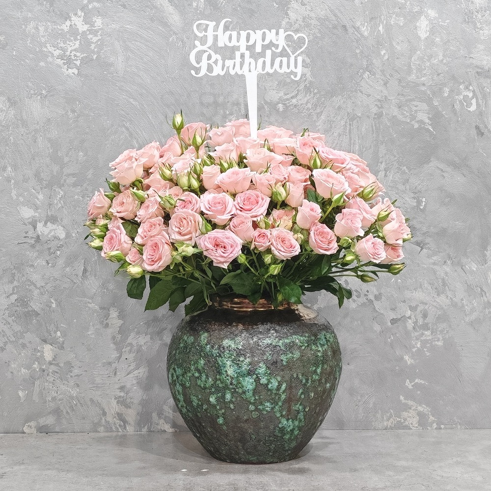 باقة تحتوي على زهور البيبي جوري الخوخية، مرتبة شكل جميل في فازة.