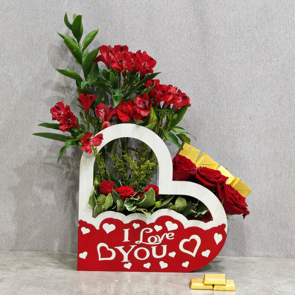 صندوق يحتوي علي زهور جلبيرا و ليسانتوس واوركيد وايكلوبتس مع مبخر.