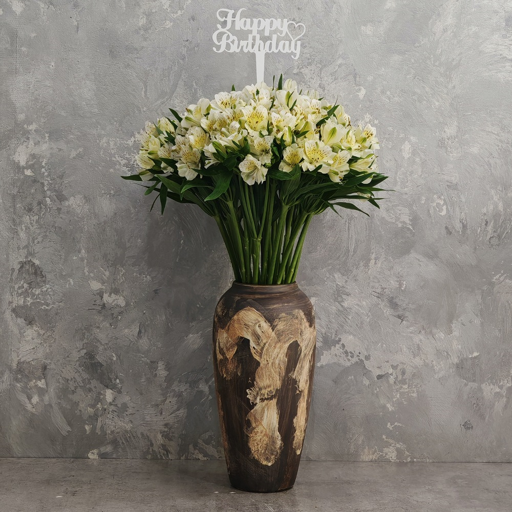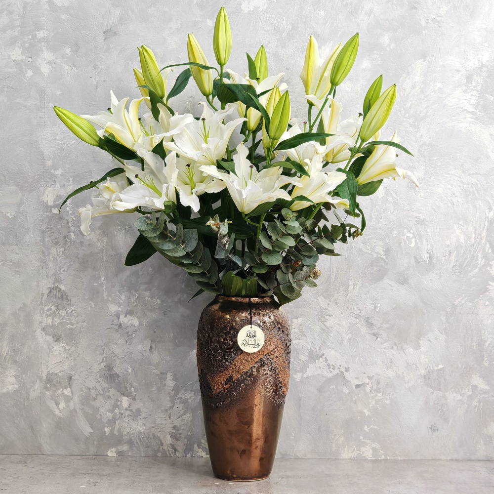 باقة تحتوي على زهور الكازابلانكا البيضاء وأوراق الأوكالبتوس، مرتبة بشكل جميل في فازة.