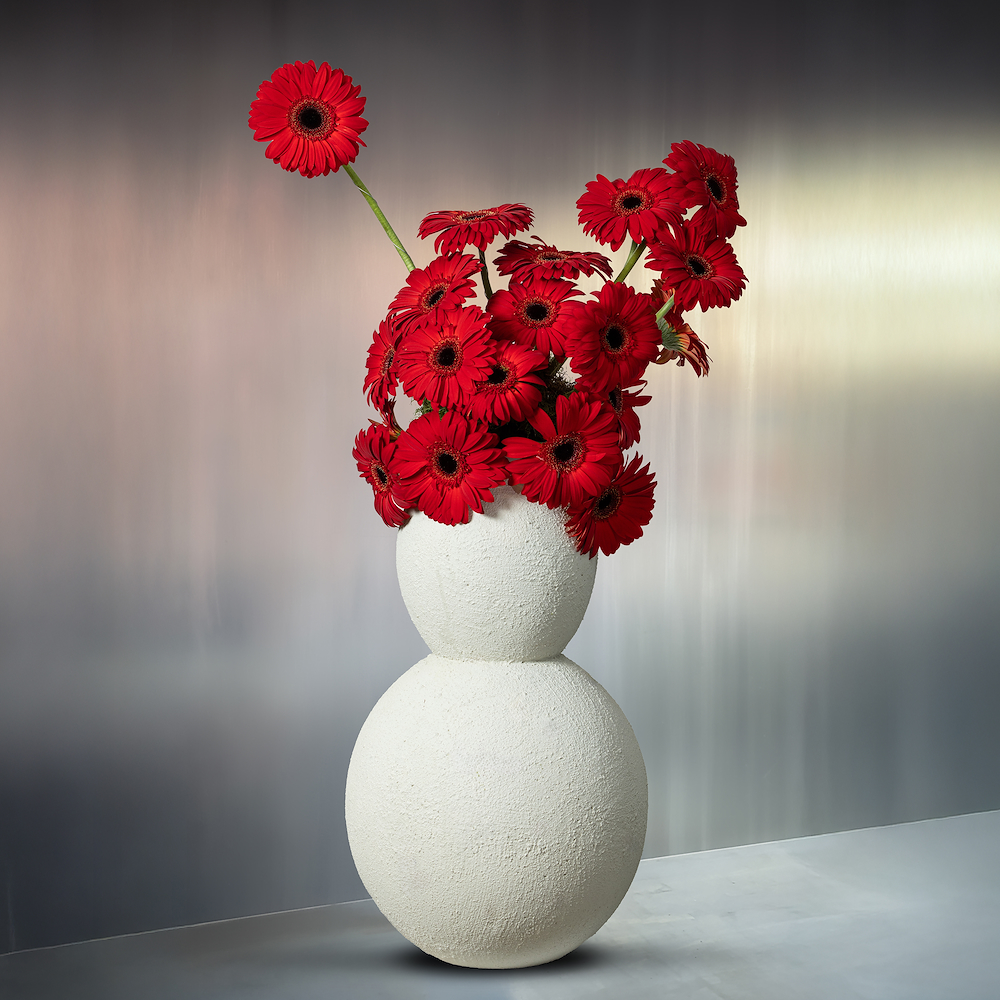 باقة تحتوي على زهور الجيربيرا الحمراء، مرتبة بشكل جميل في فازة.