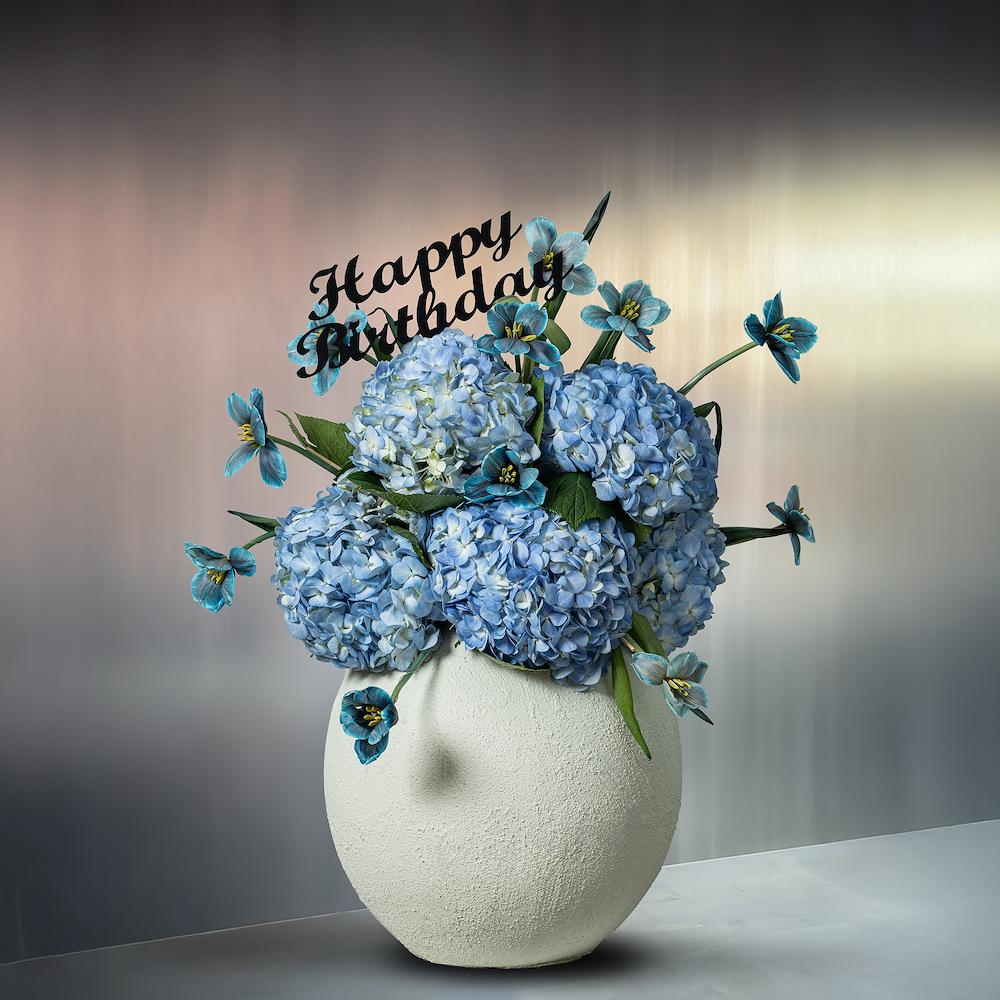 باقة تحتوي على زهور الهايدرينجا والتوليب الزرقاء، مرتبة بشكل جميل في فازة.
