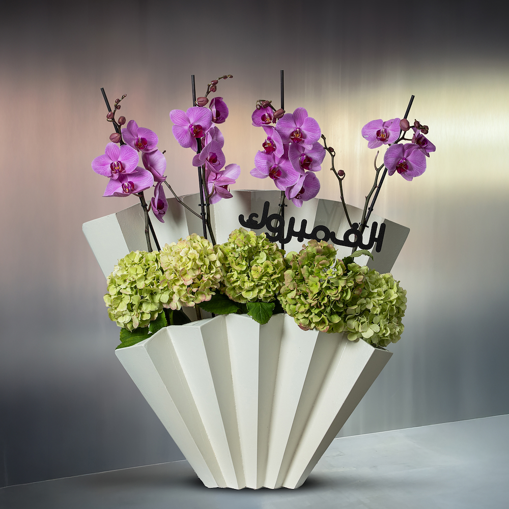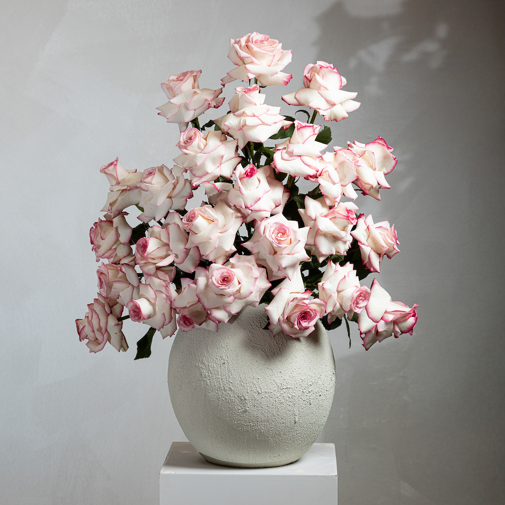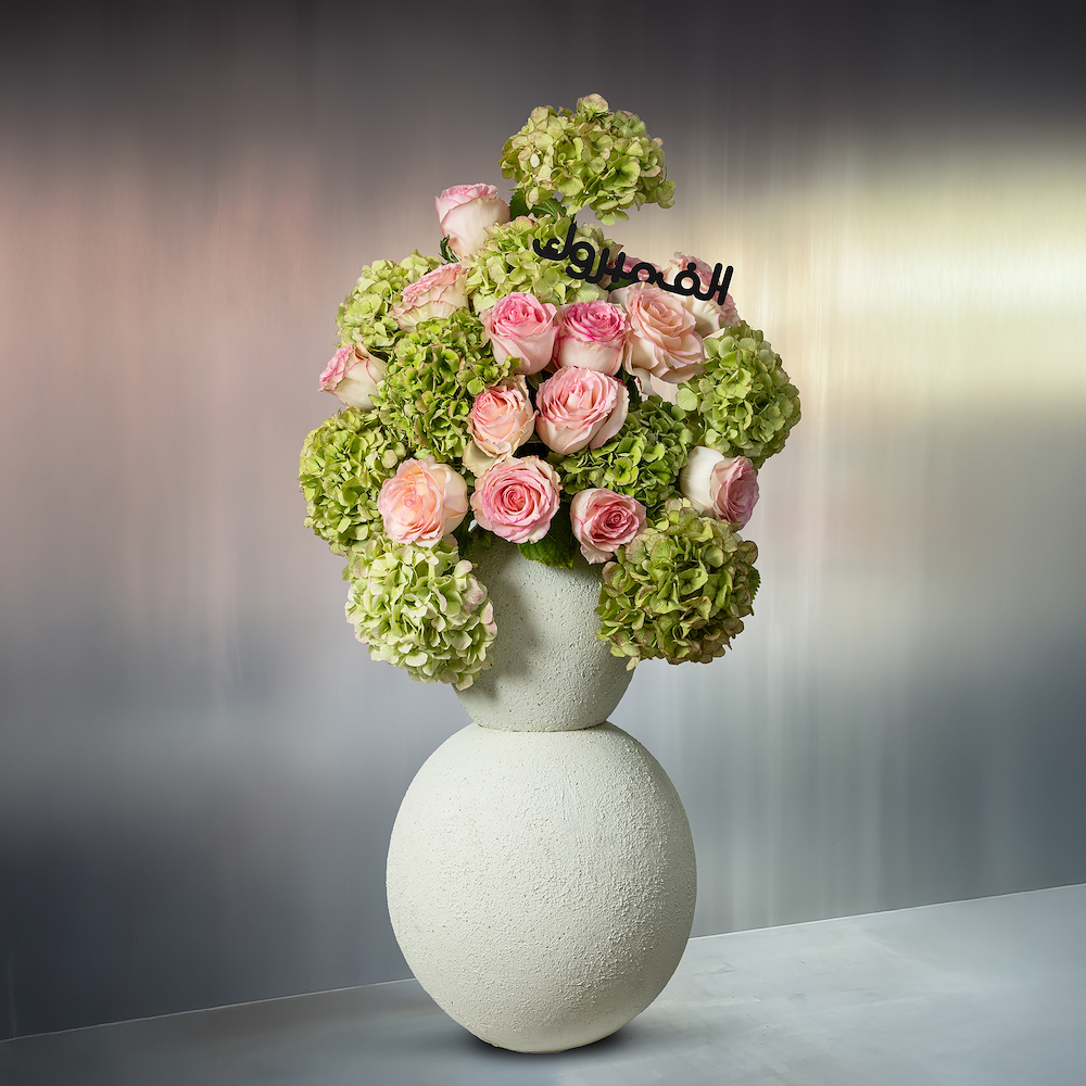 باقة تحتوي على زهور الجوري الوردية، مرتبة بشكل جميل في فازة.