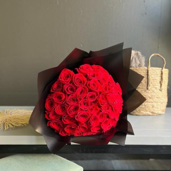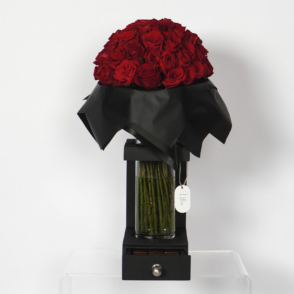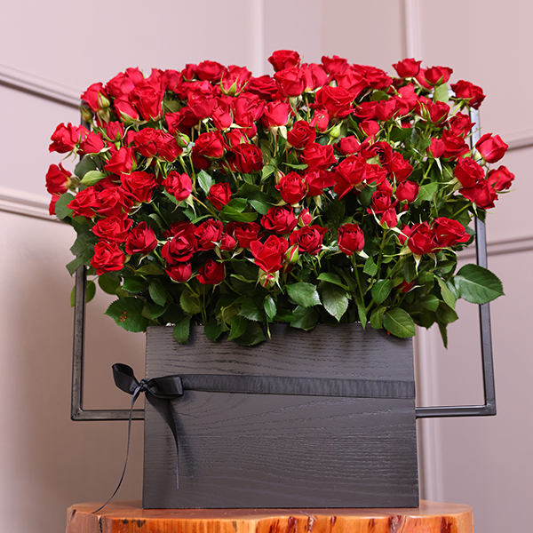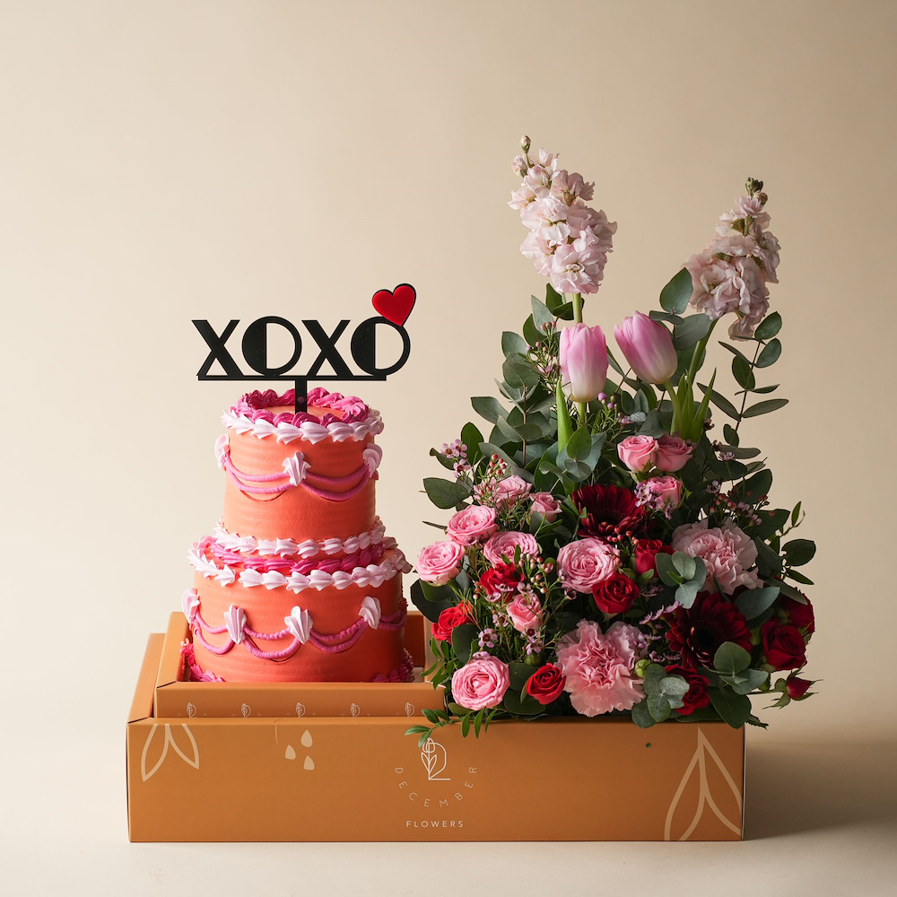 بوكس مليئ بالبيبي روز، زهور الكرنيشن والتوليب مع كيكة بحجم 6 انش بمزيج من الفانيلا والشوكولاتة.