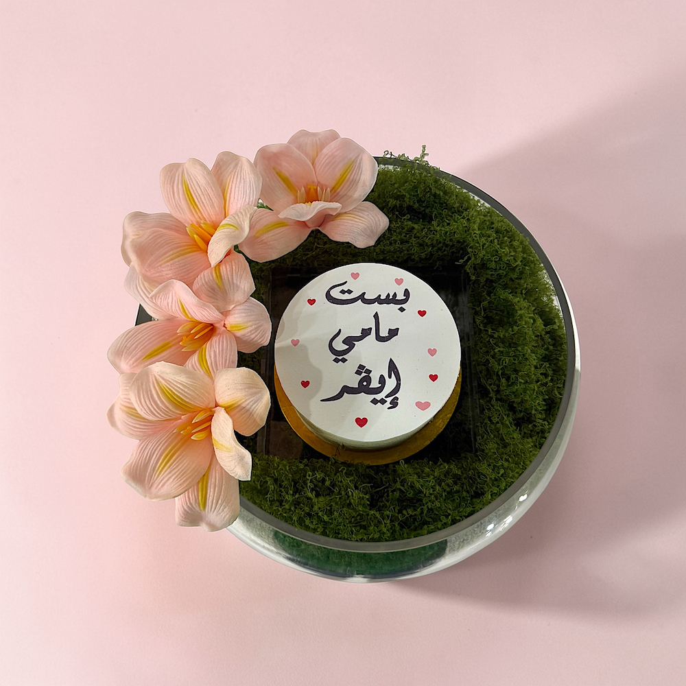 باقة تحتوي على زهور صناعية، مرتبة في فازة مع كيكة.