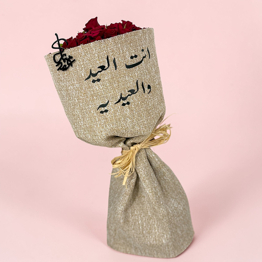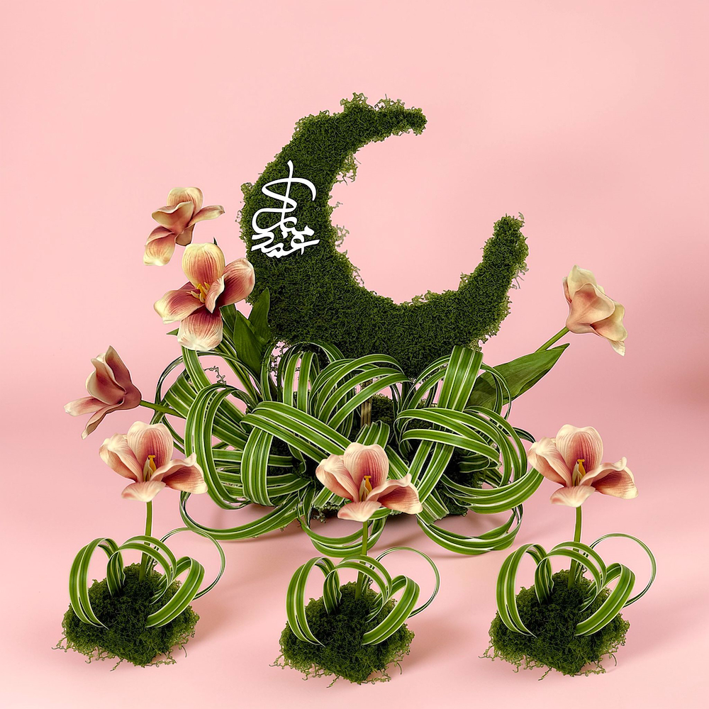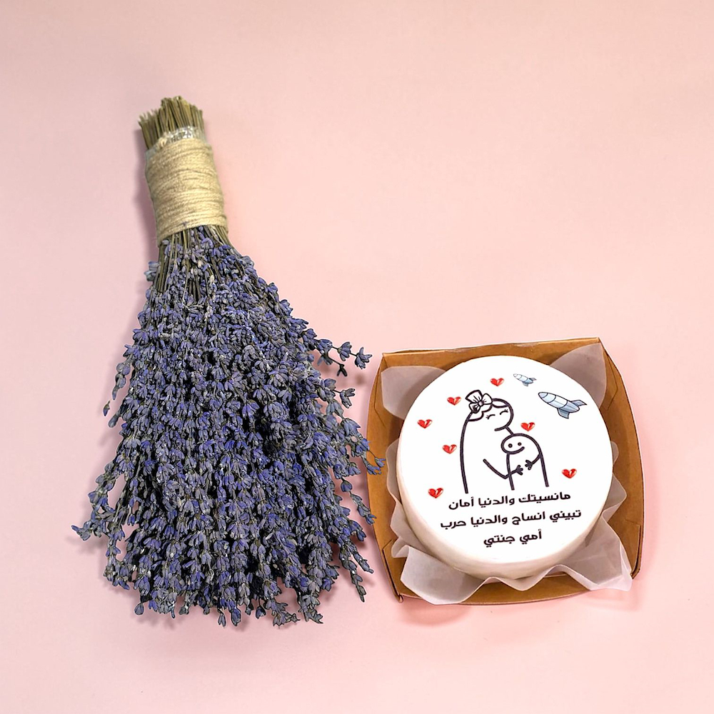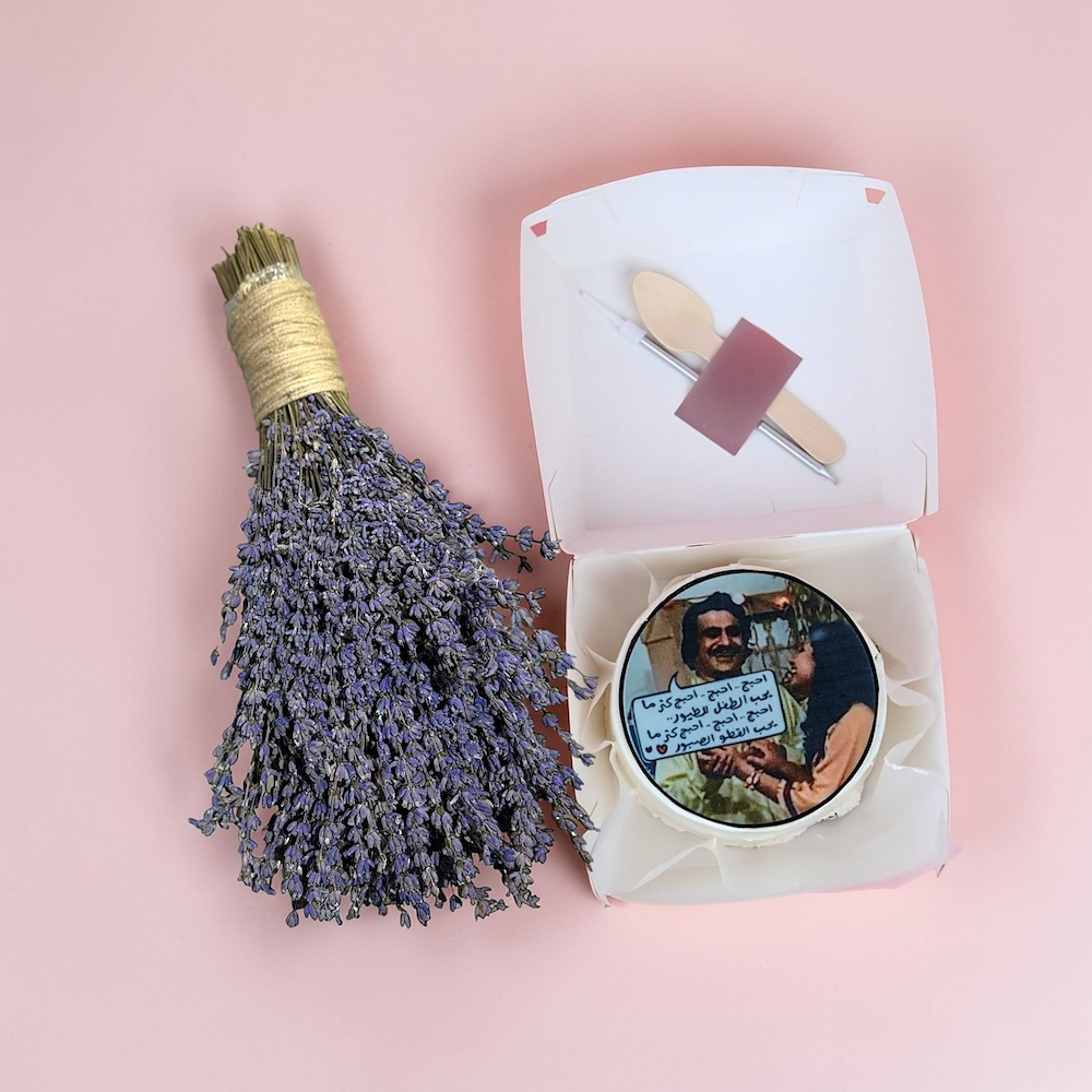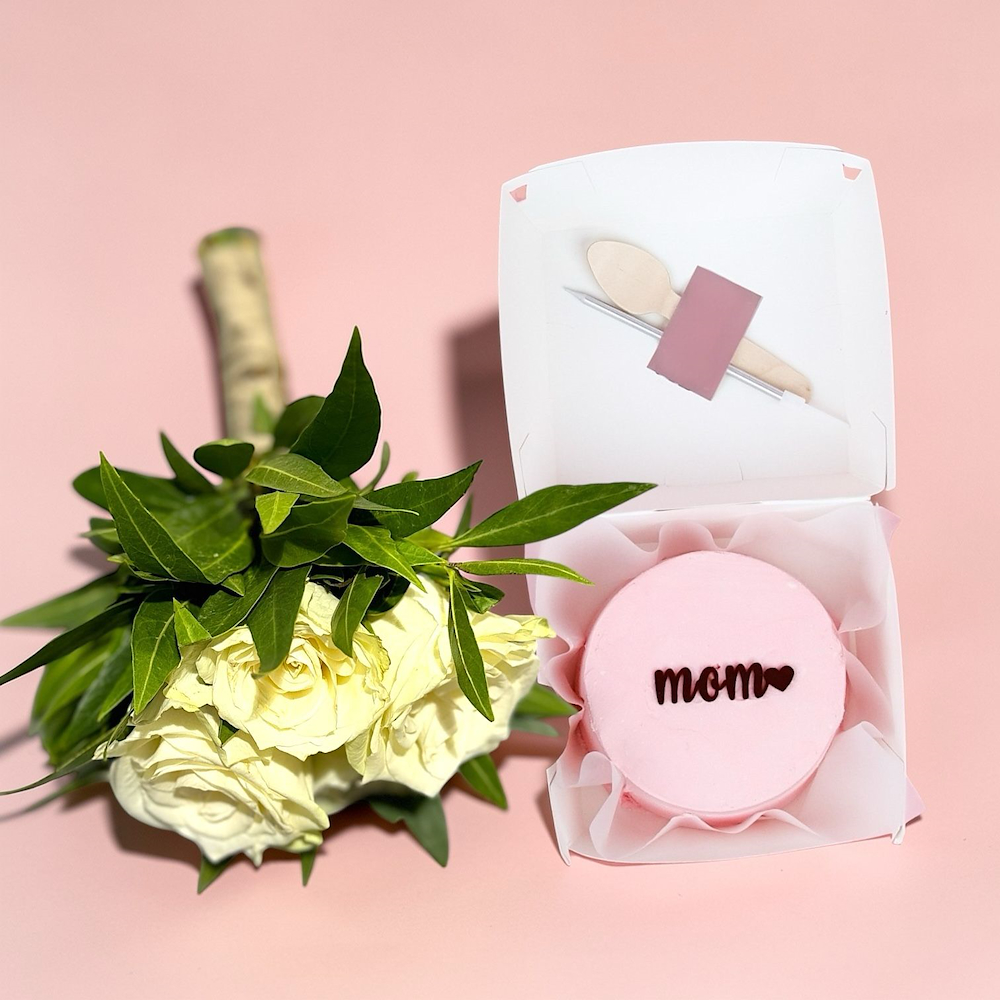 باقة تحتوي على زهور صناعية، مرتبة في فازة مع كيكة.