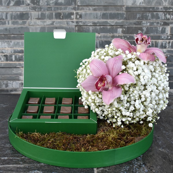 فلات بوكيه يحتوي على زهور النمنم الابيض وعلبة شوكولاتة.
