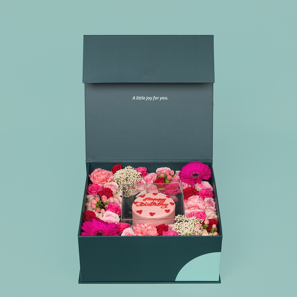 صينية أكريليك تحتوي على زهور الجربيرا البيضاء، التوليب الأبيض، الايرينجيوم والأوراق الخضراء مع كيكة يوم الميلاد.
