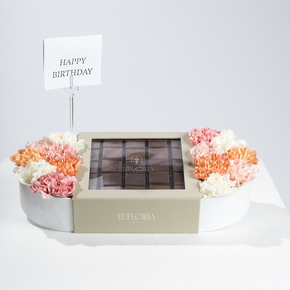 صندوق رقيق يضم 50 قطعة من مربعات شوكولاتة فاخرة مرتبة على مستويين فخمين، محاط بمزيج دافئ وناعم من الكارنيشن، يشمل 20-25 كارنيشن مختلط باللون الوردي الفاتح، باللون الخوخي البرتقالي الناعم، وباللون الأبيض النقي.