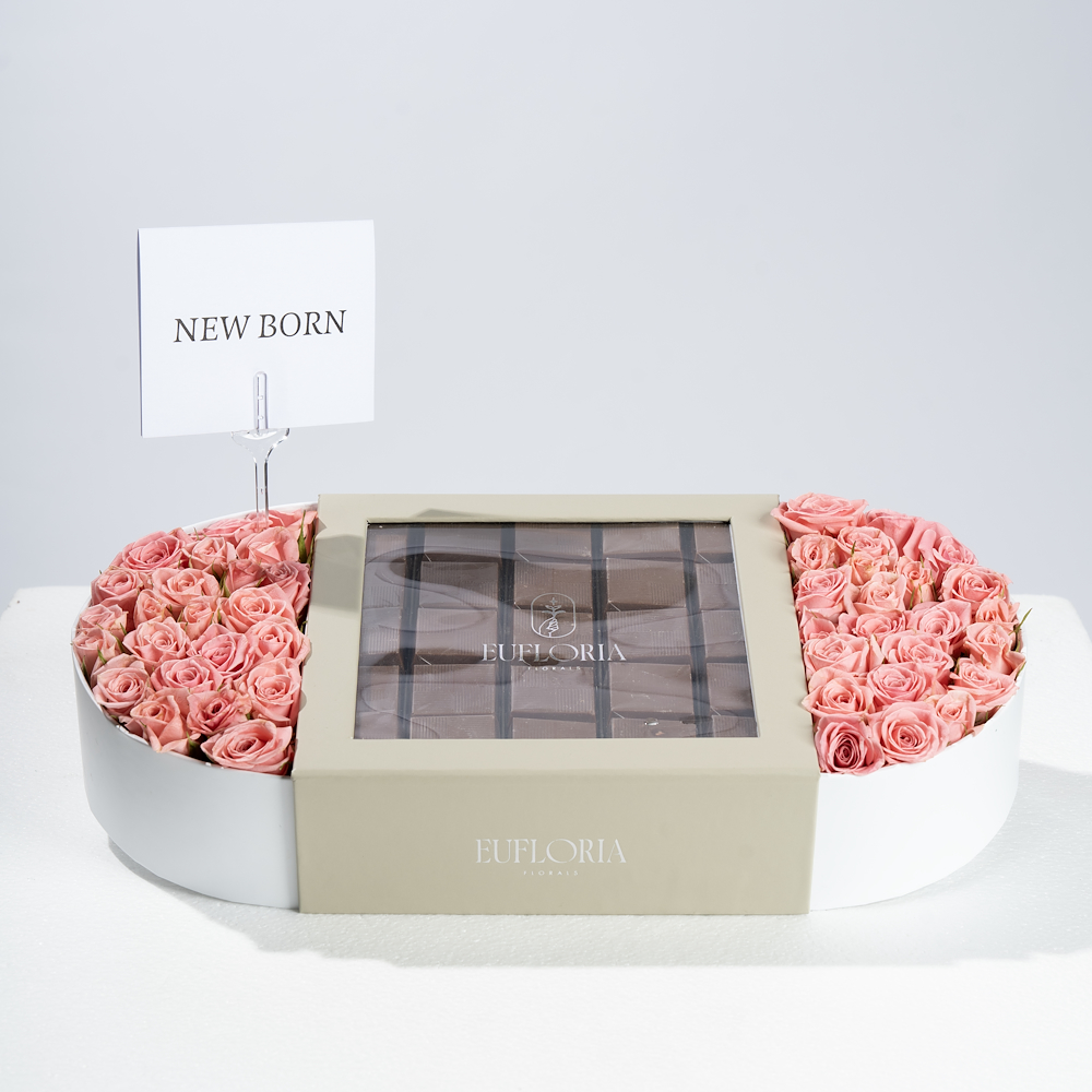 صندوق رقيق يضم 50 قطعة من مربعات شوكولاتة فاخرة مرتبة على مستويين فخمين، محاط بعرض كثيف من الورود الوردية الخجولة، ما يقارب 50-60 ساقا.