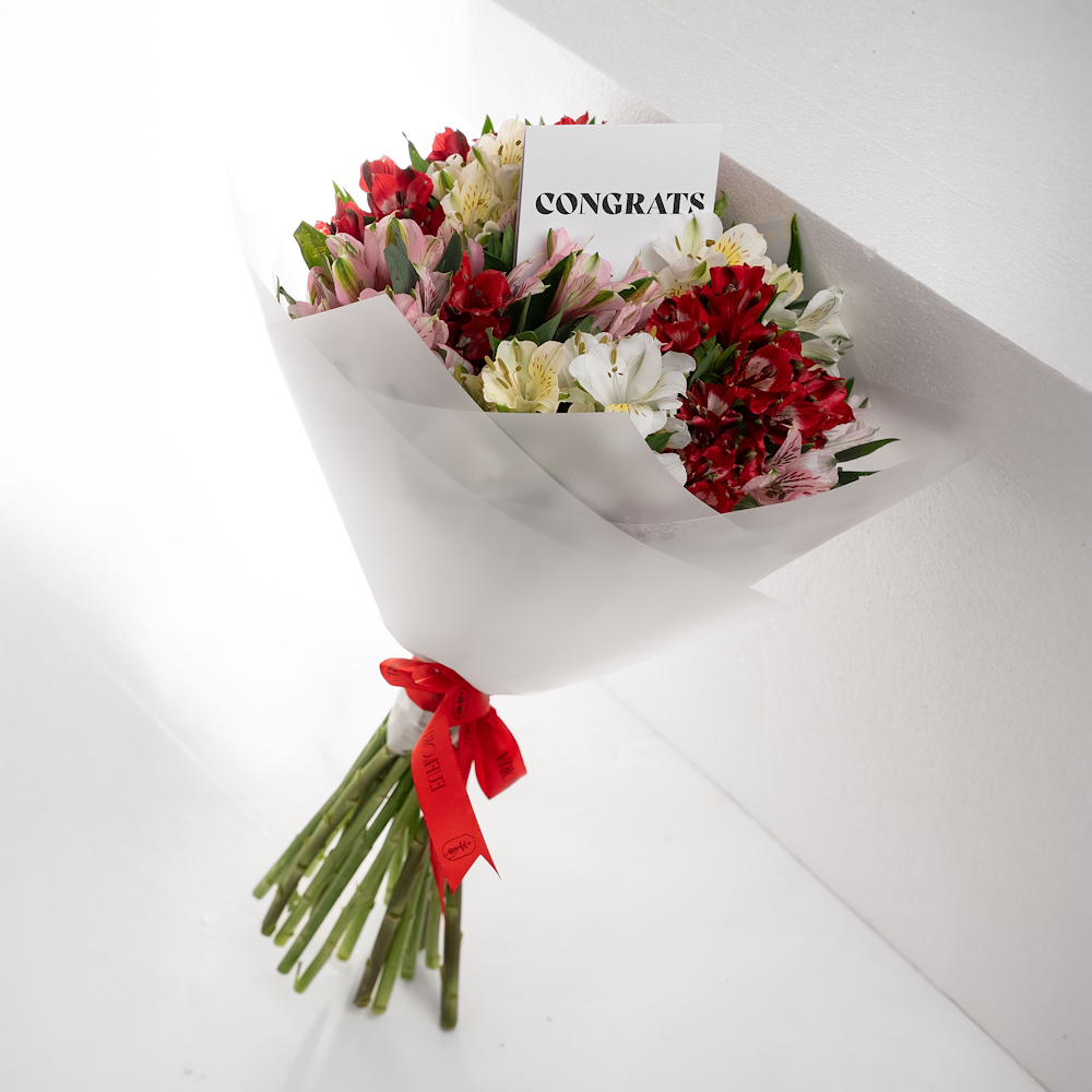 باقة تحتوي على 15 غصن من أزهار السترومريا الجميلة باللون الأبيض، الوردي والأحمر، مع حقيبة مميزة.